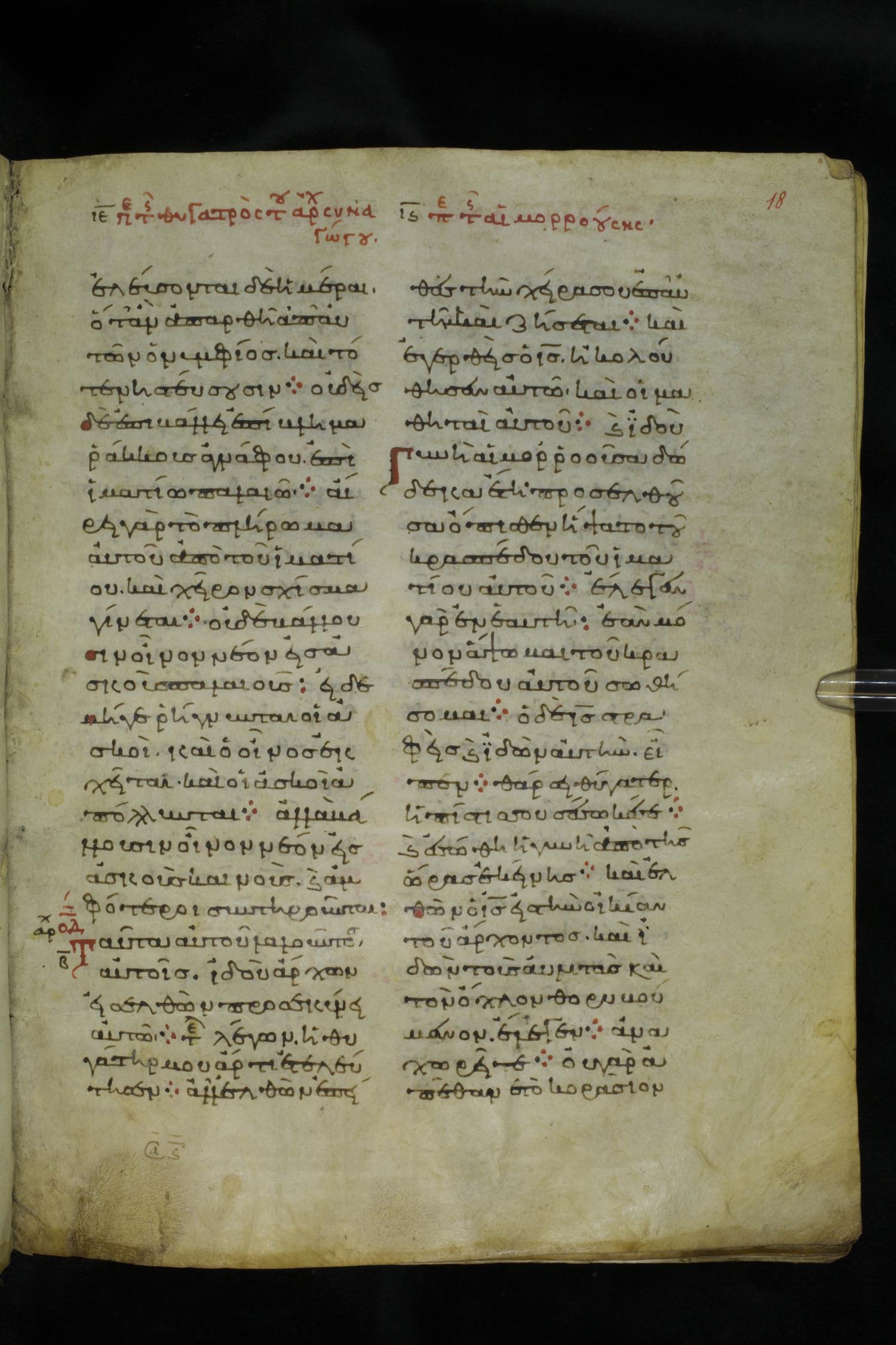 Eleventh century minuscule of the Gospels on parchment; 219 leaves, 2 columns, 26 lines per column. Images were taken at the National Library of Greece in Athens.