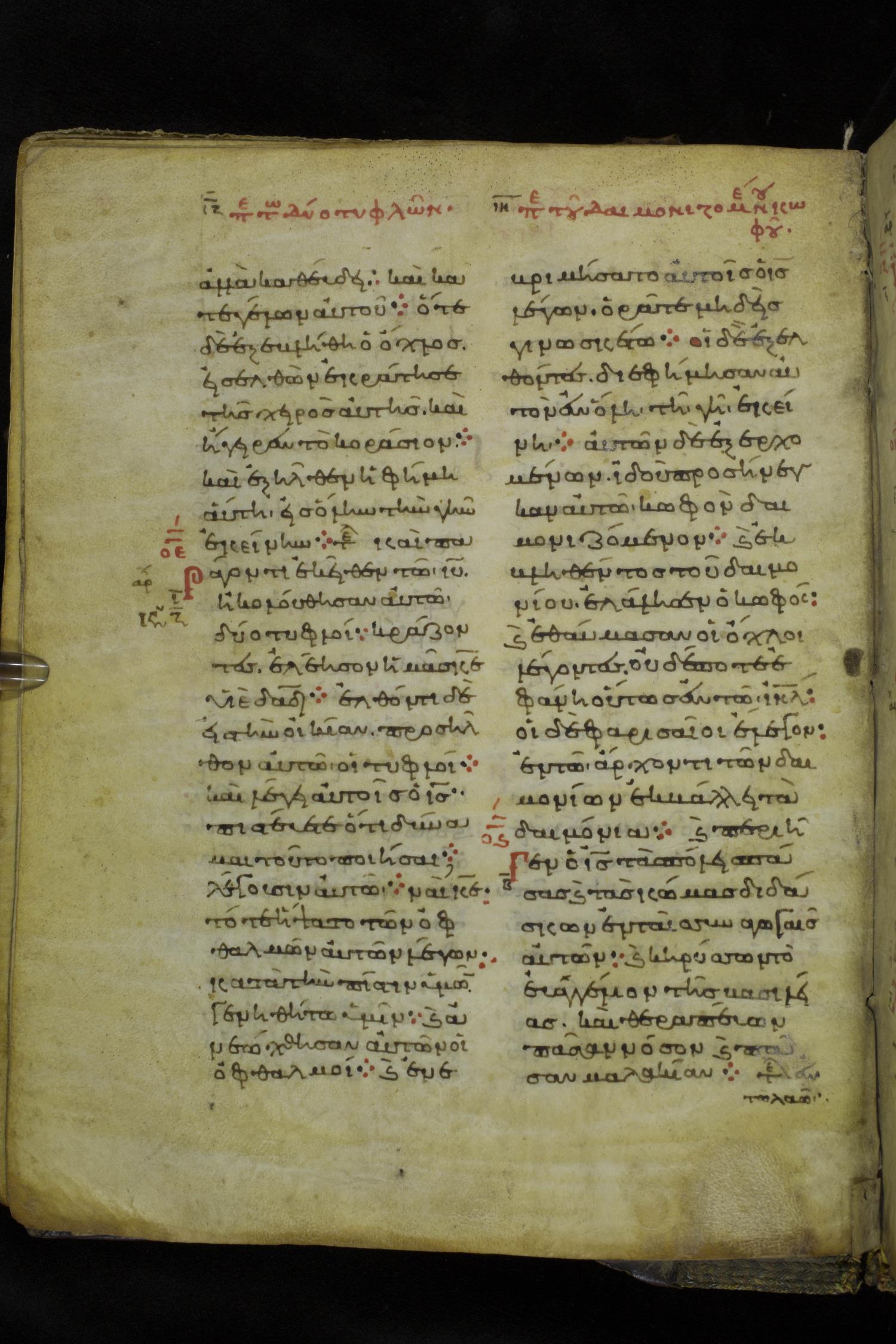 Eleventh century minuscule of the Gospels on parchment; 219 leaves, 2 columns, 26 lines per column. Images were taken at the National Library of Greece in Athens.
