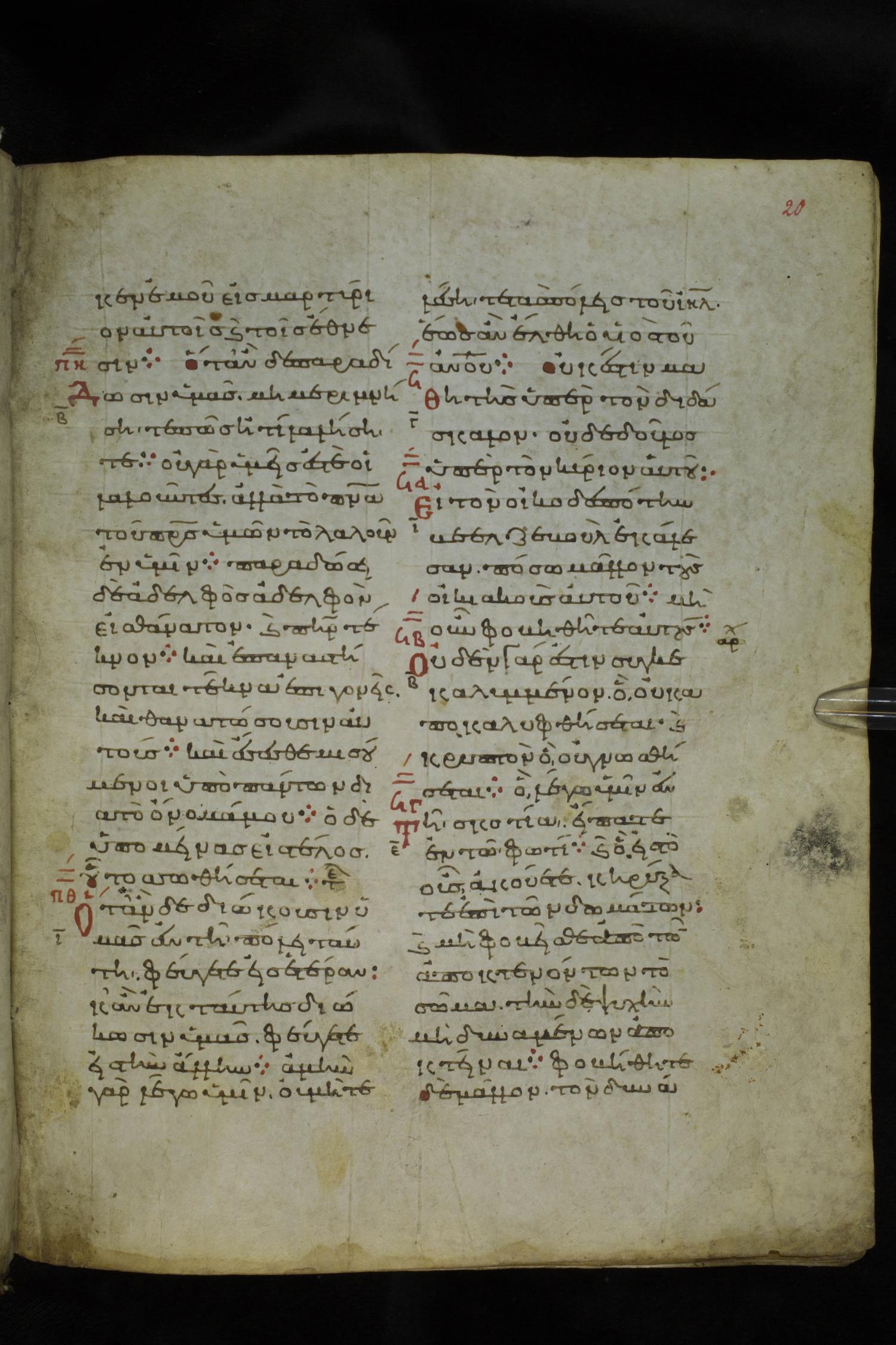 Eleventh century minuscule of the Gospels on parchment; 219 leaves, 2 columns, 26 lines per column. Images were taken at the National Library of Greece in Athens.