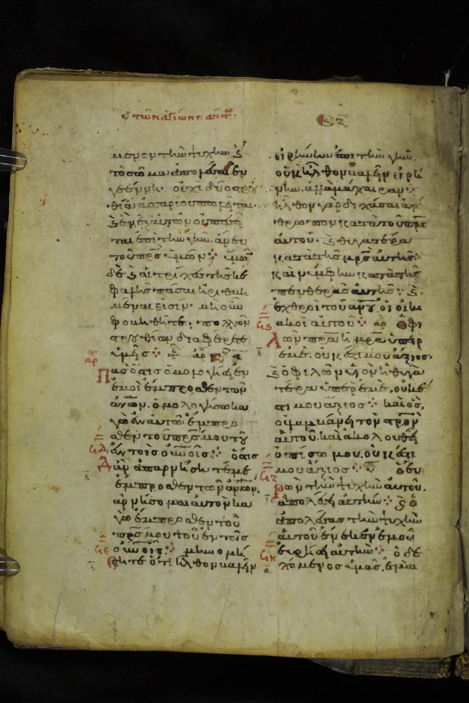 Eleventh century minuscule of the Gospels on parchment; 219 leaves, 2 columns, 26 lines per column. Images were taken at the National Library of Greece in Athens.