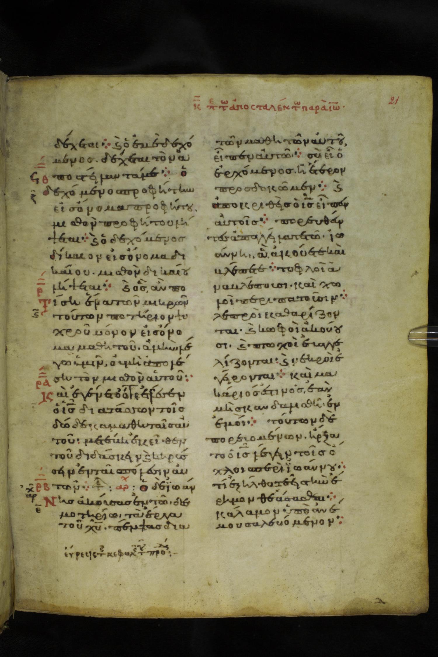 Eleventh century minuscule of the Gospels on parchment; 219 leaves, 2 columns, 26 lines per column. Images were taken at the National Library of Greece in Athens.