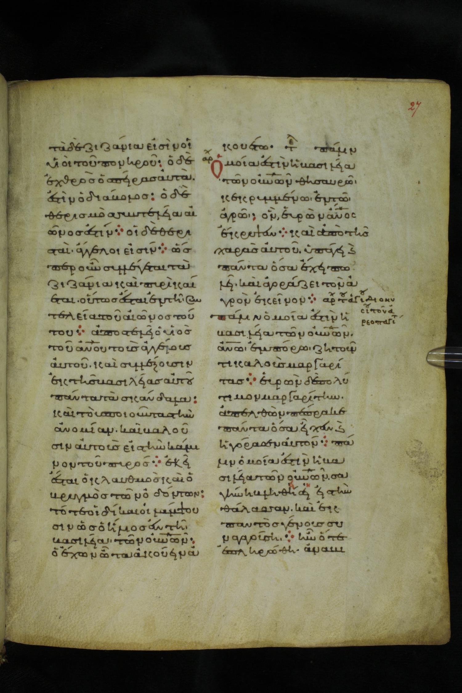 Eleventh century minuscule of the Gospels on parchment; 219 leaves, 2 columns, 26 lines per column. Images were taken at the National Library of Greece in Athens.