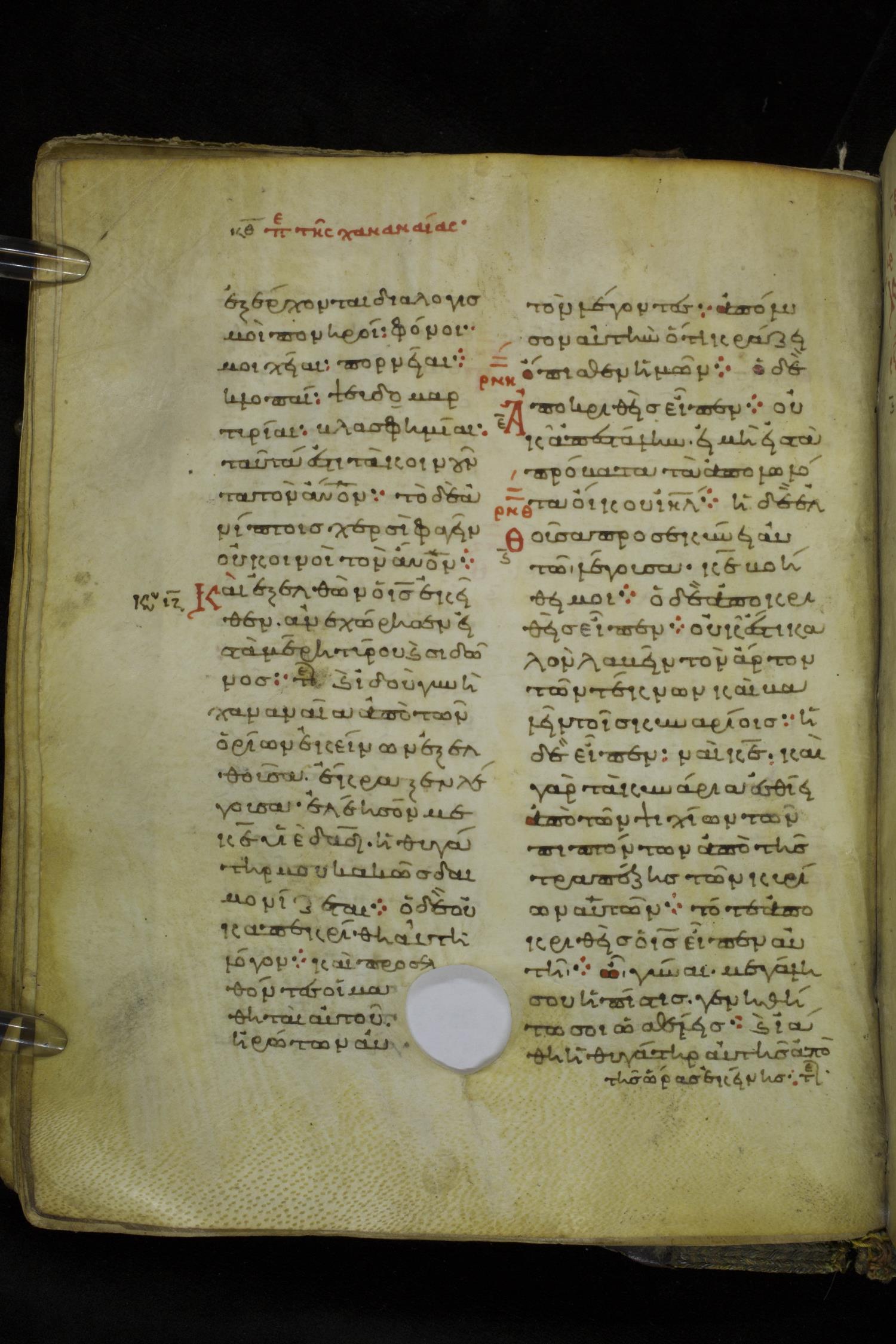 Eleventh century minuscule of the Gospels on parchment; 219 leaves, 2 columns, 26 lines per column. Images were taken at the National Library of Greece in Athens.
