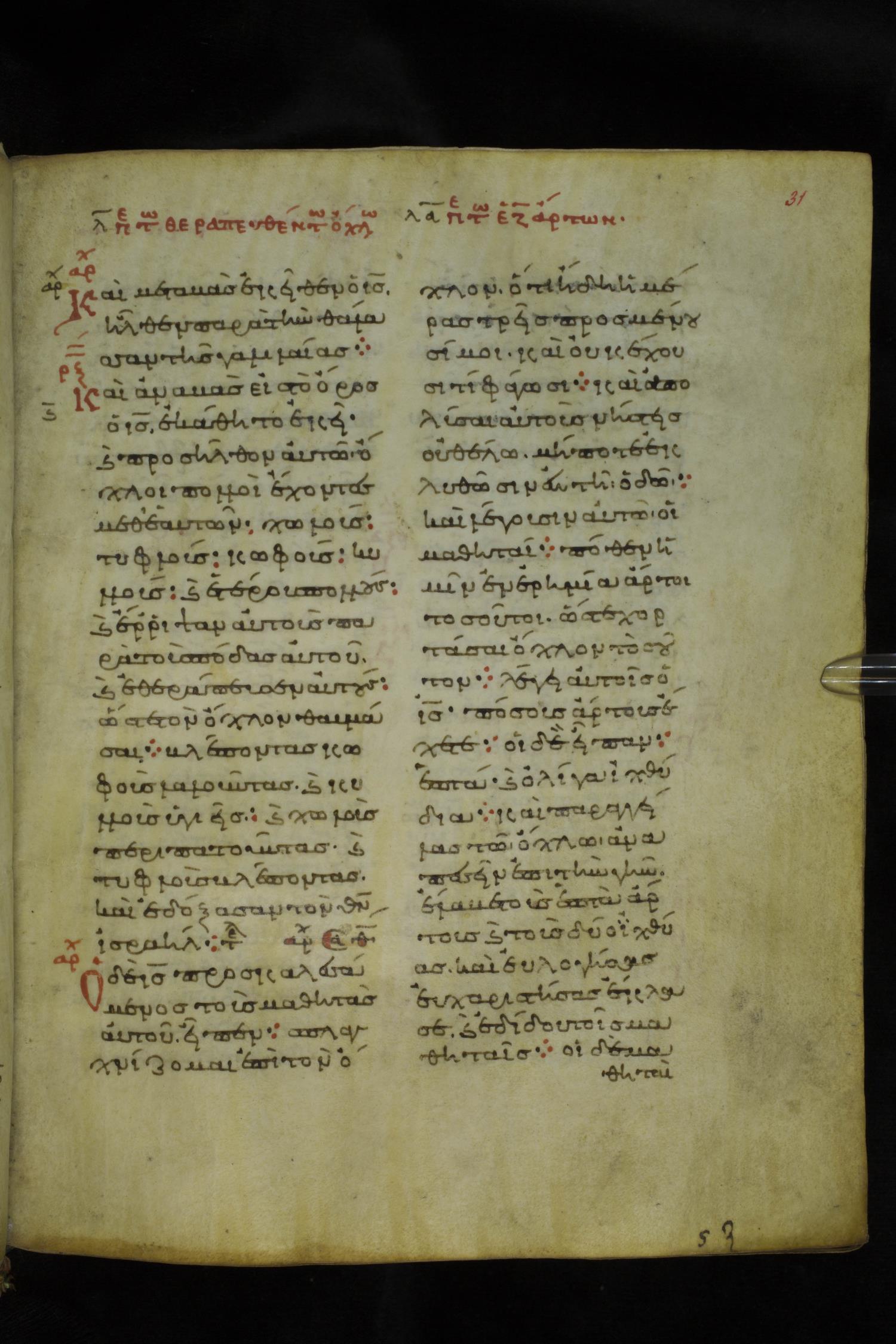 Eleventh century minuscule of the Gospels on parchment; 219 leaves, 2 columns, 26 lines per column. Images were taken at the National Library of Greece in Athens.
