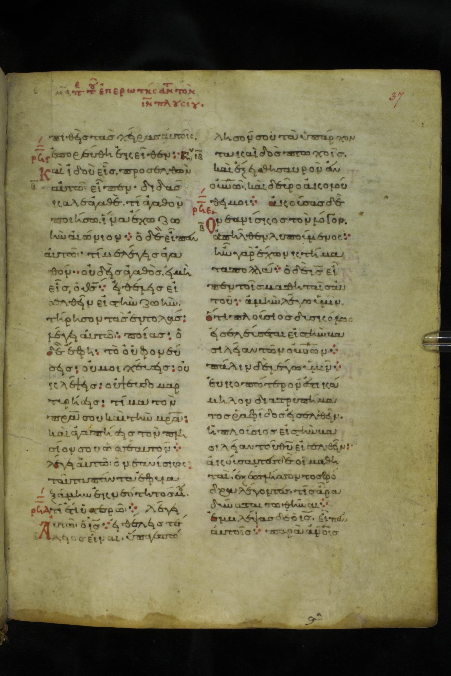 Eleventh century minuscule of the Gospels on parchment; 219 leaves, 2 columns, 26 lines per column. Images were taken at the National Library of Greece in Athens.