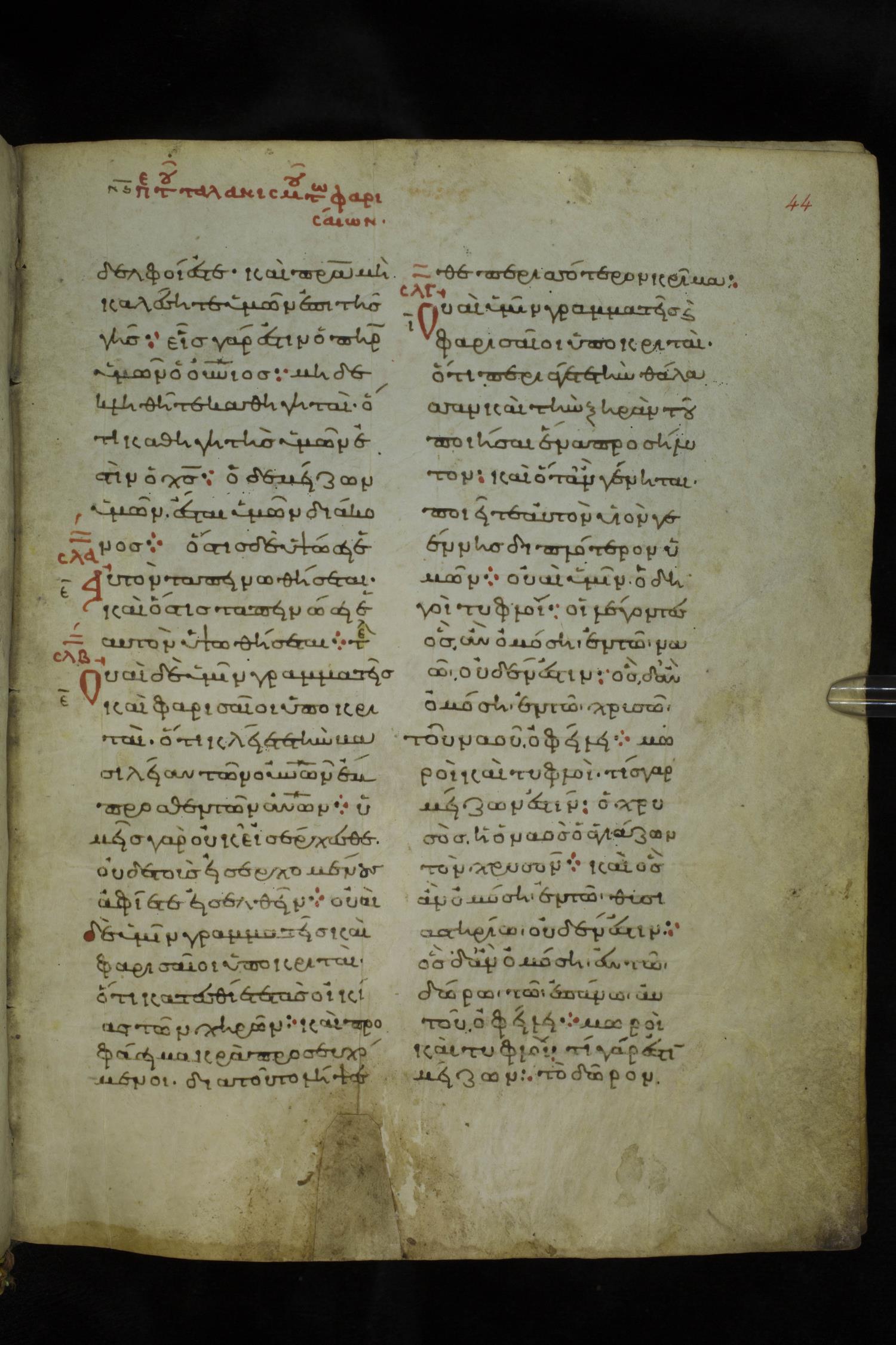 Eleventh century minuscule of the Gospels on parchment; 219 leaves, 2 columns, 26 lines per column. Images were taken at the National Library of Greece in Athens.
