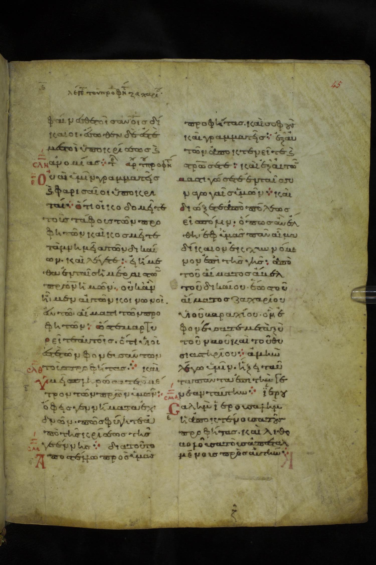 Eleventh century minuscule of the Gospels on parchment; 219 leaves, 2 columns, 26 lines per column. Images were taken at the National Library of Greece in Athens.