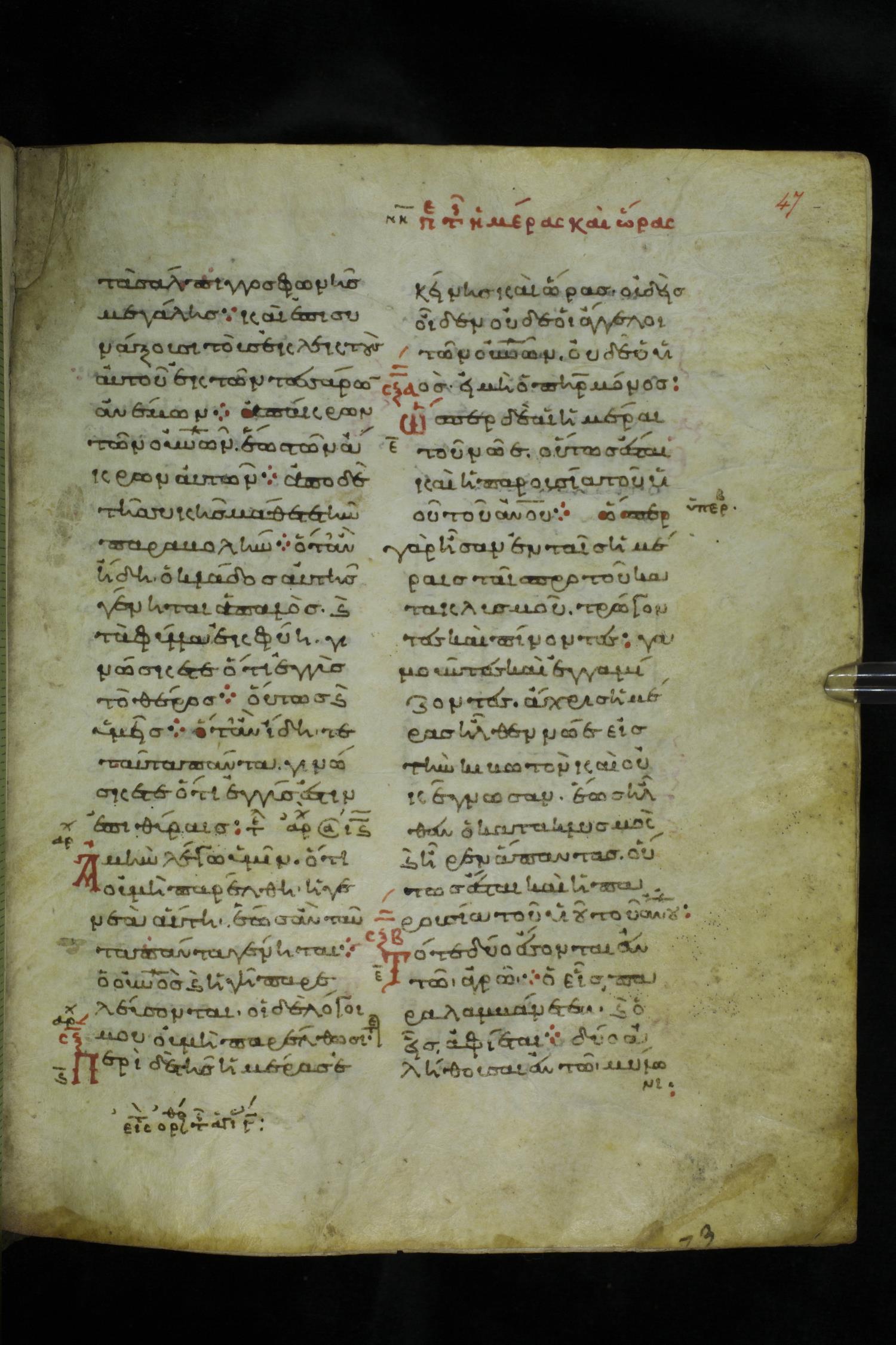 Eleventh century minuscule of the Gospels on parchment; 219 leaves, 2 columns, 26 lines per column. Images were taken at the National Library of Greece in Athens.
