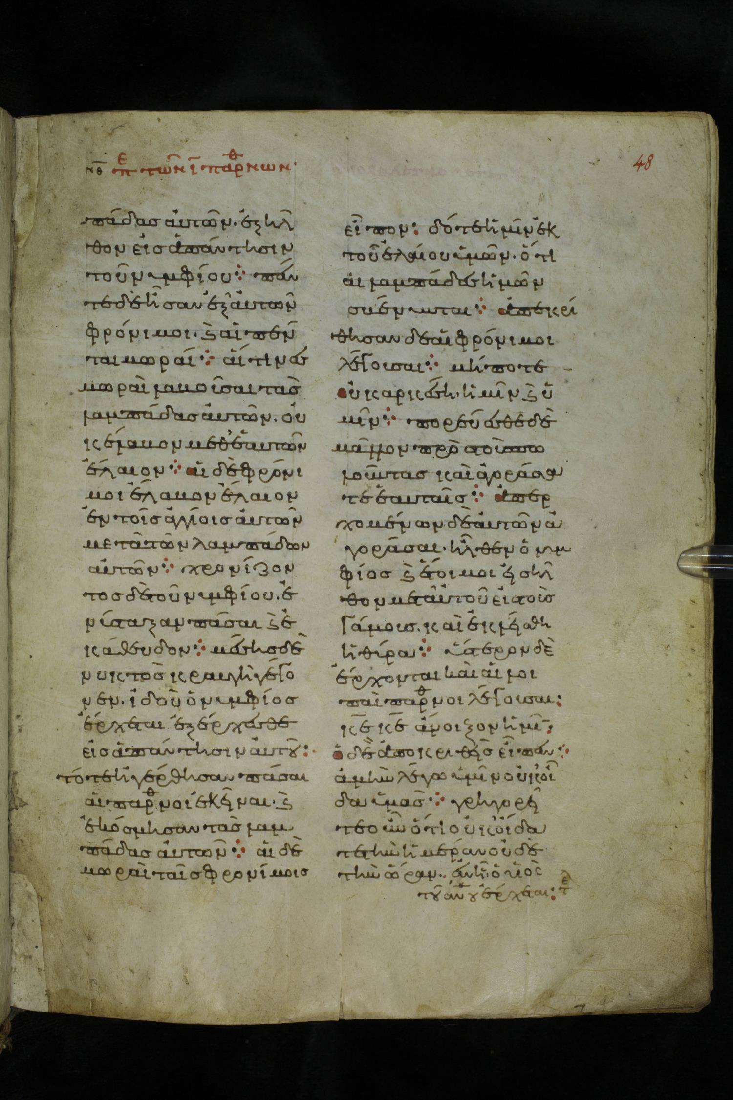 Eleventh century minuscule of the Gospels on parchment; 219 leaves, 2 columns, 26 lines per column. Images were taken at the National Library of Greece in Athens.