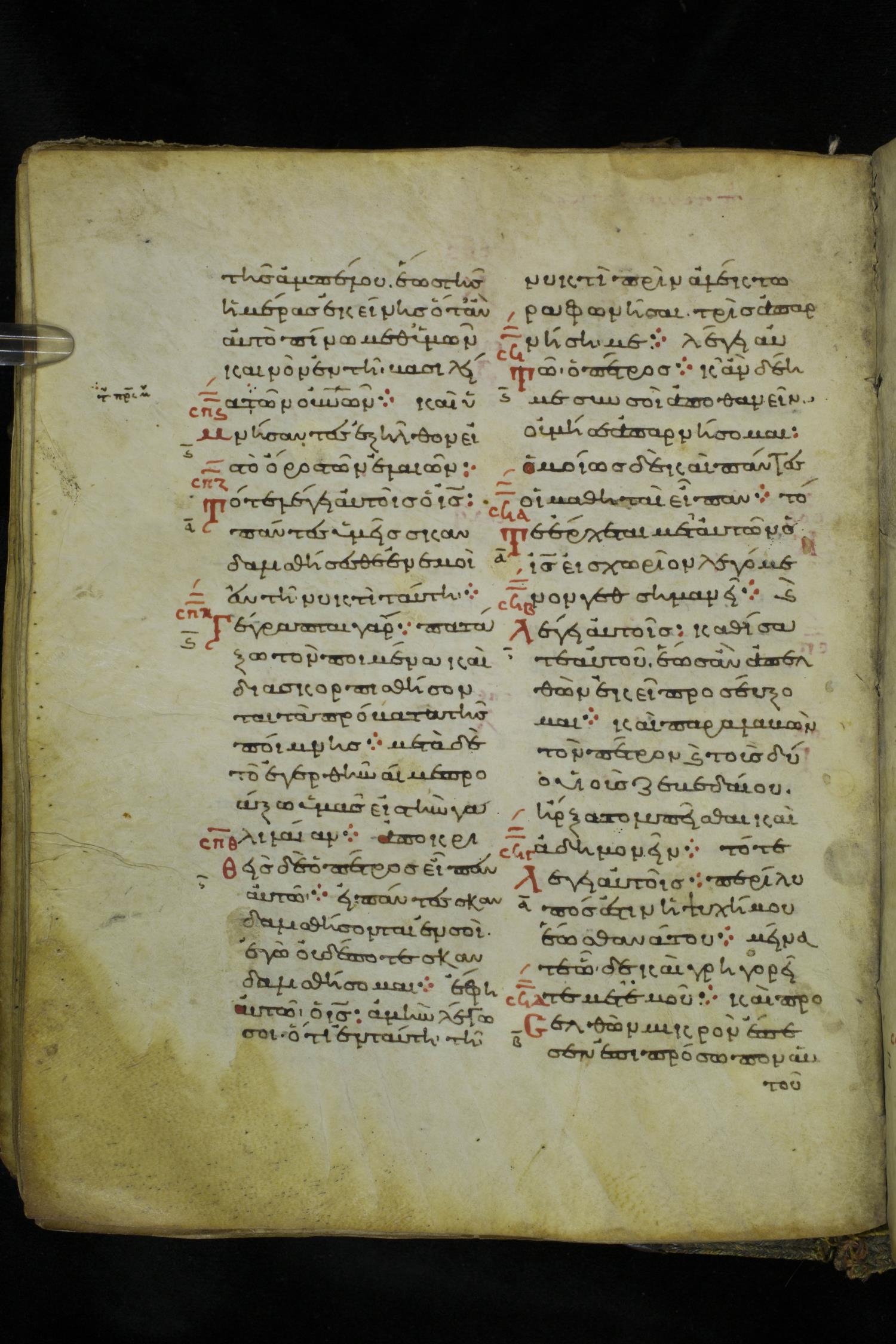 Eleventh century minuscule of the Gospels on parchment; 219 leaves, 2 columns, 26 lines per column. Images were taken at the National Library of Greece in Athens.