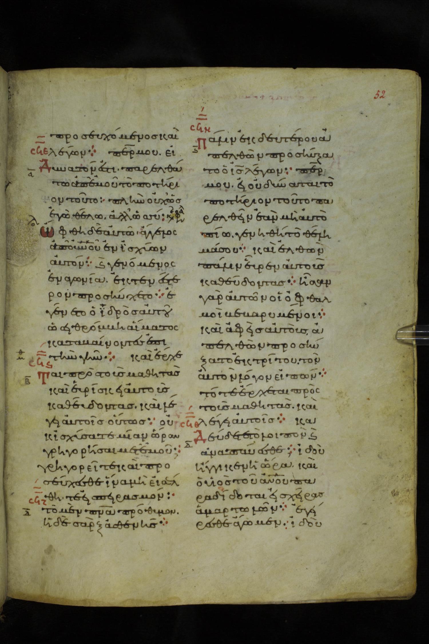 Eleventh century minuscule of the Gospels on parchment; 219 leaves, 2 columns, 26 lines per column. Images were taken at the National Library of Greece in Athens.