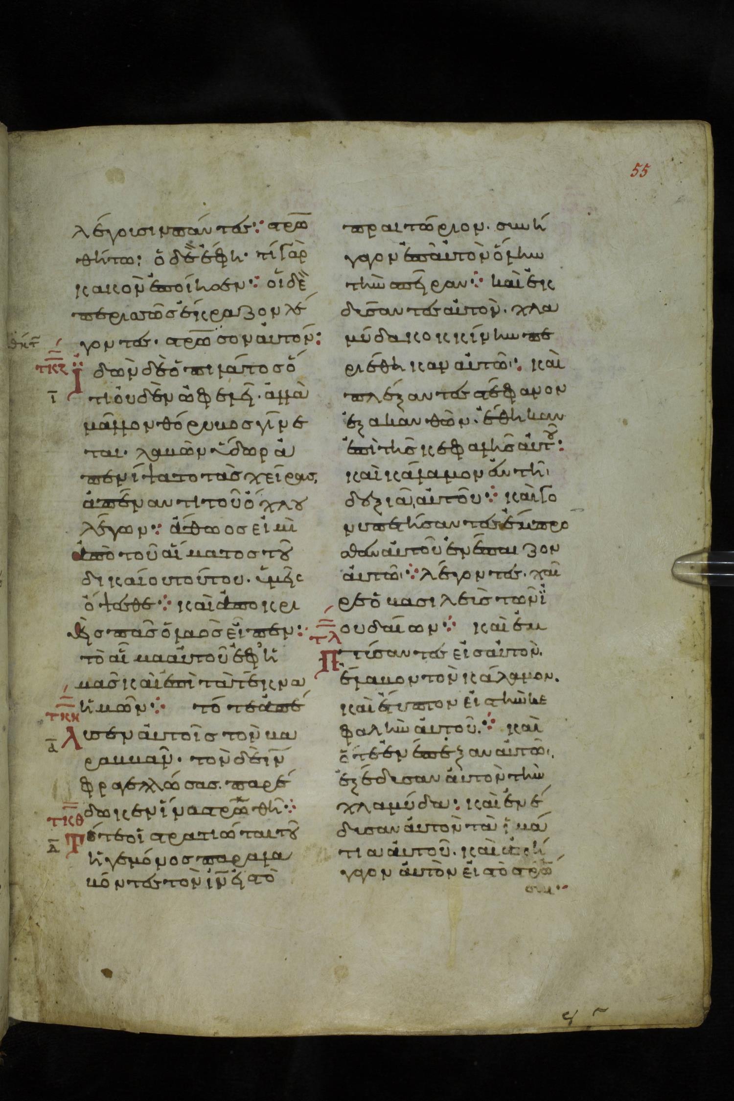 Eleventh century minuscule of the Gospels on parchment; 219 leaves, 2 columns, 26 lines per column. Images were taken at the National Library of Greece in Athens.