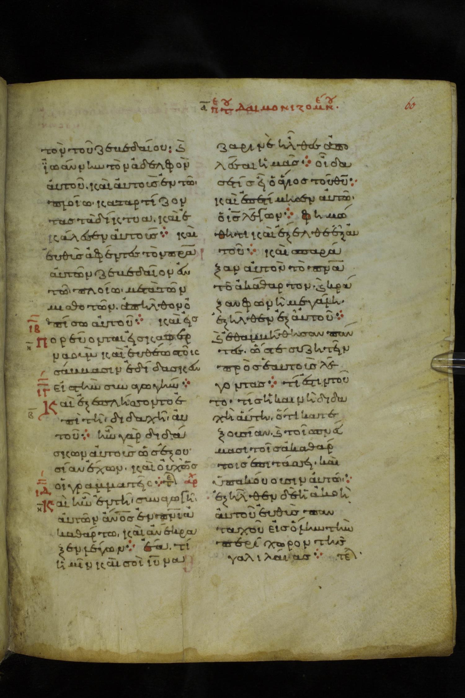 Eleventh century minuscule of the Gospels on parchment; 219 leaves, 2 columns, 26 lines per column. Images were taken at the National Library of Greece in Athens.