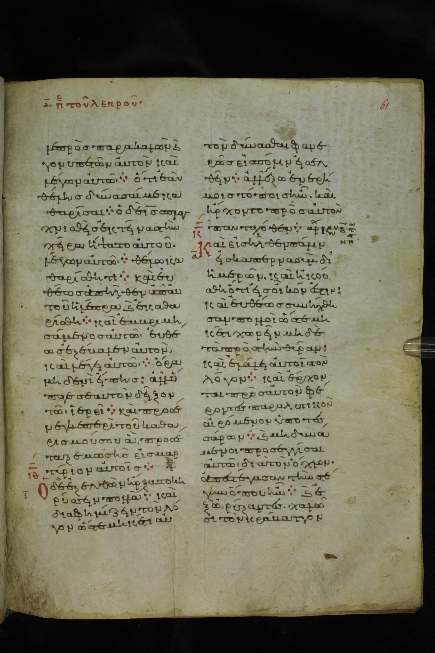 Eleventh century minuscule of the Gospels on parchment; 219 leaves, 2 columns, 26 lines per column. Images were taken at the National Library of Greece in Athens.