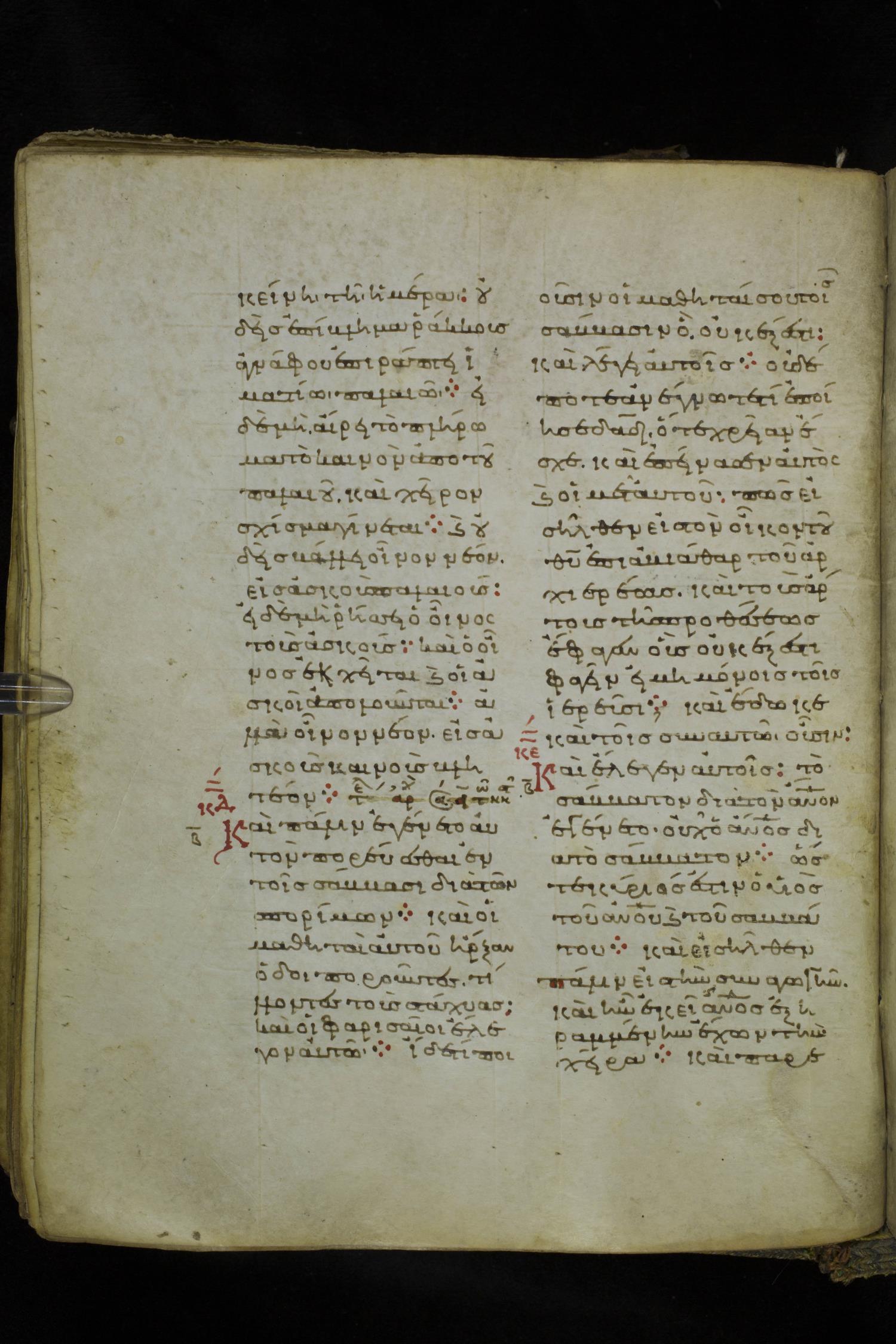 Eleventh century minuscule of the Gospels on parchment; 219 leaves, 2 columns, 26 lines per column. Images were taken at the National Library of Greece in Athens.