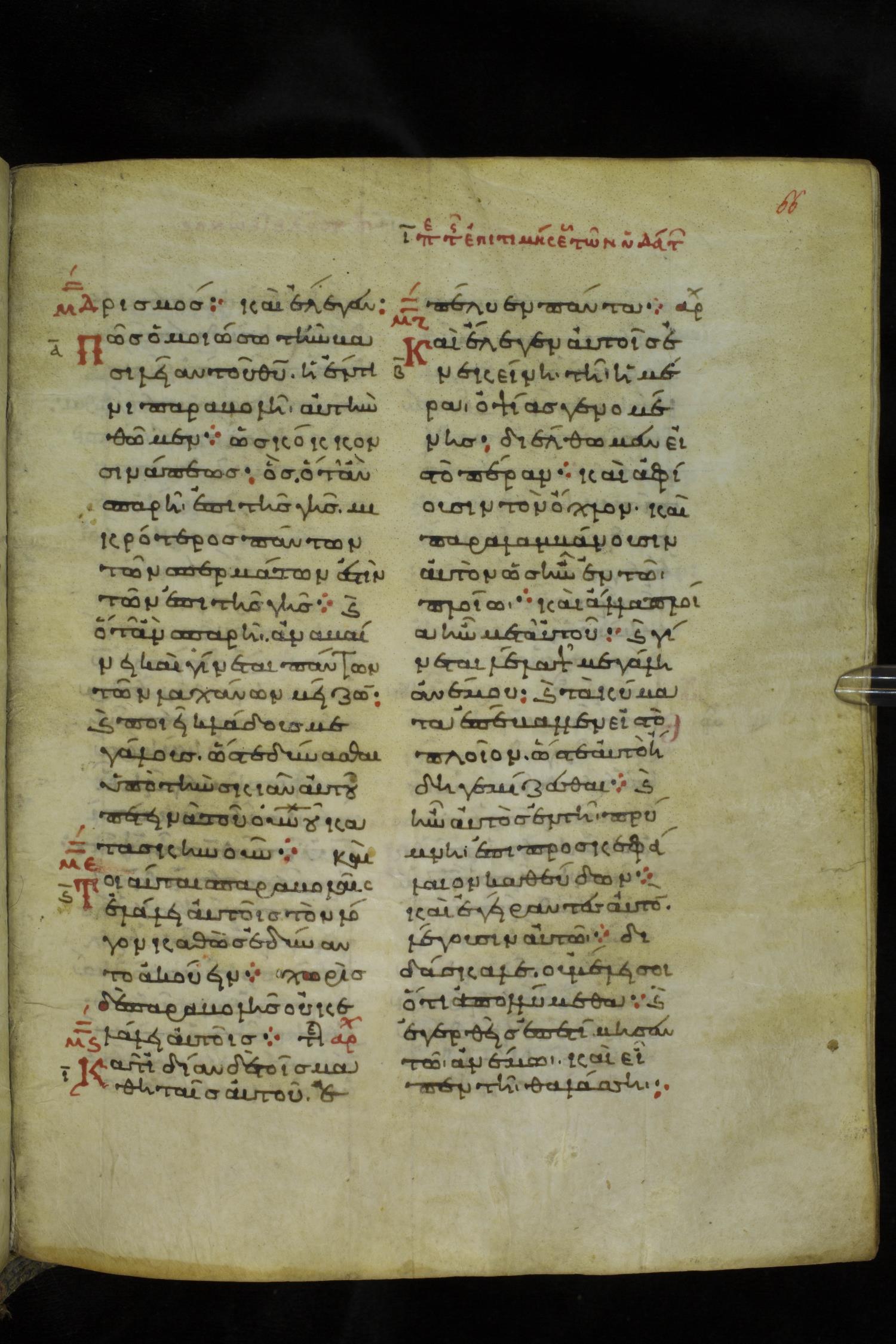 Eleventh century minuscule of the Gospels on parchment; 219 leaves, 2 columns, 26 lines per column. Images were taken at the National Library of Greece in Athens.