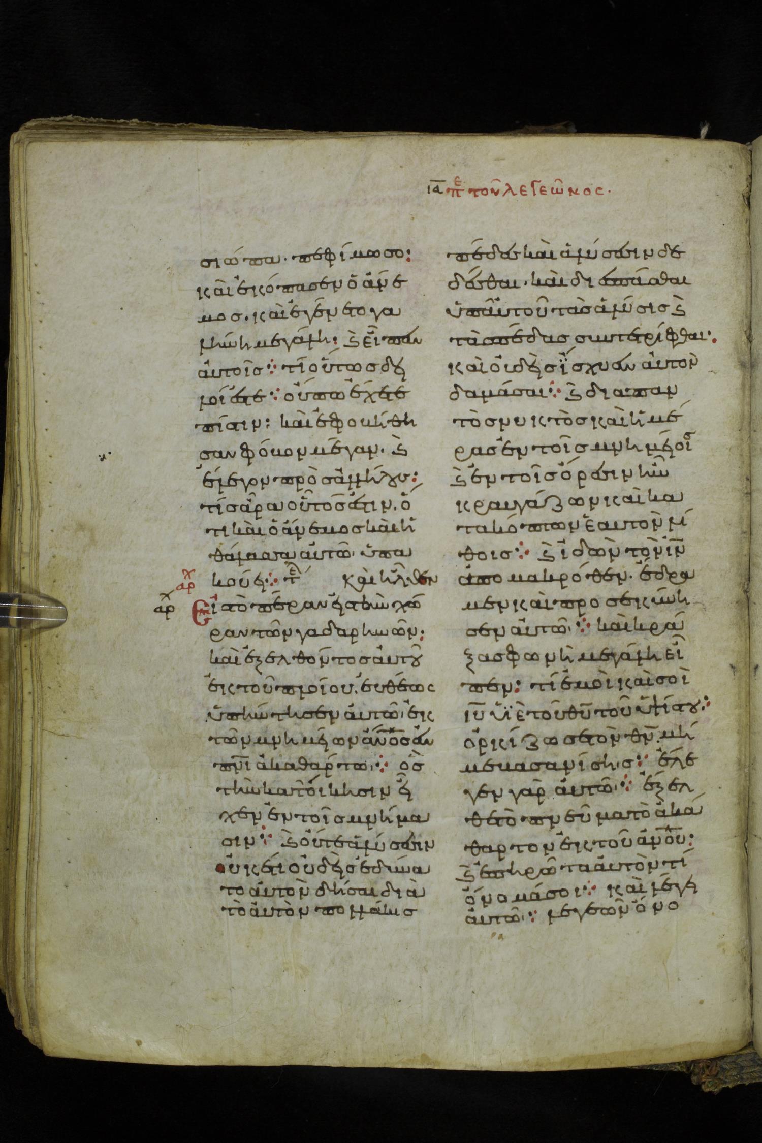 Eleventh century minuscule of the Gospels on parchment; 219 leaves, 2 columns, 26 lines per column. Images were taken at the National Library of Greece in Athens.