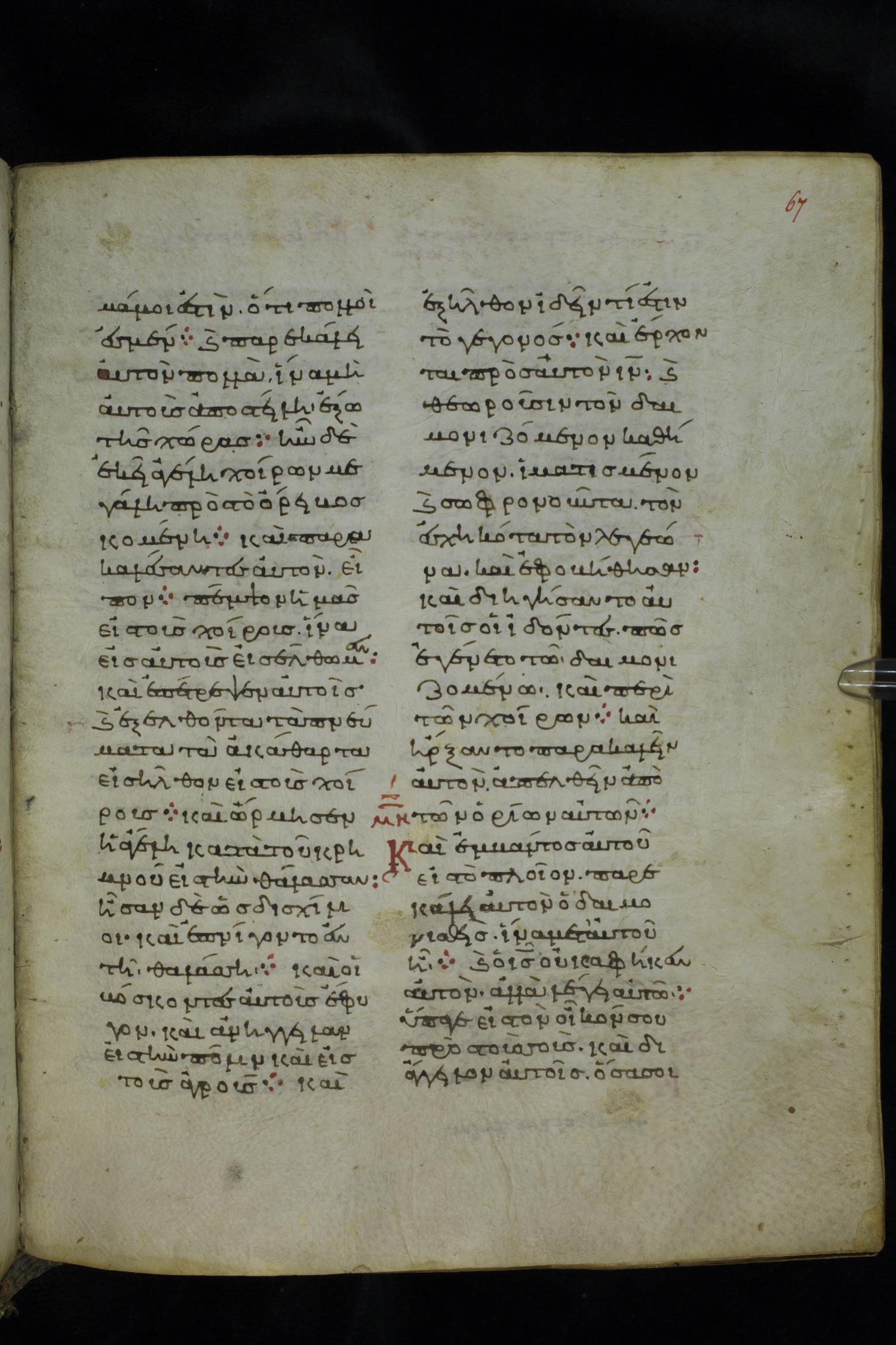 Eleventh century minuscule of the Gospels on parchment; 219 leaves, 2 columns, 26 lines per column. Images were taken at the National Library of Greece in Athens.