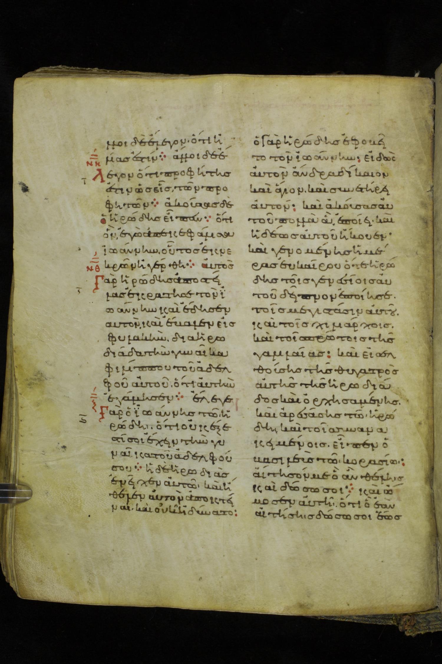 Eleventh century minuscule of the Gospels on parchment; 219 leaves, 2 columns, 26 lines per column. Images were taken at the National Library of Greece in Athens.