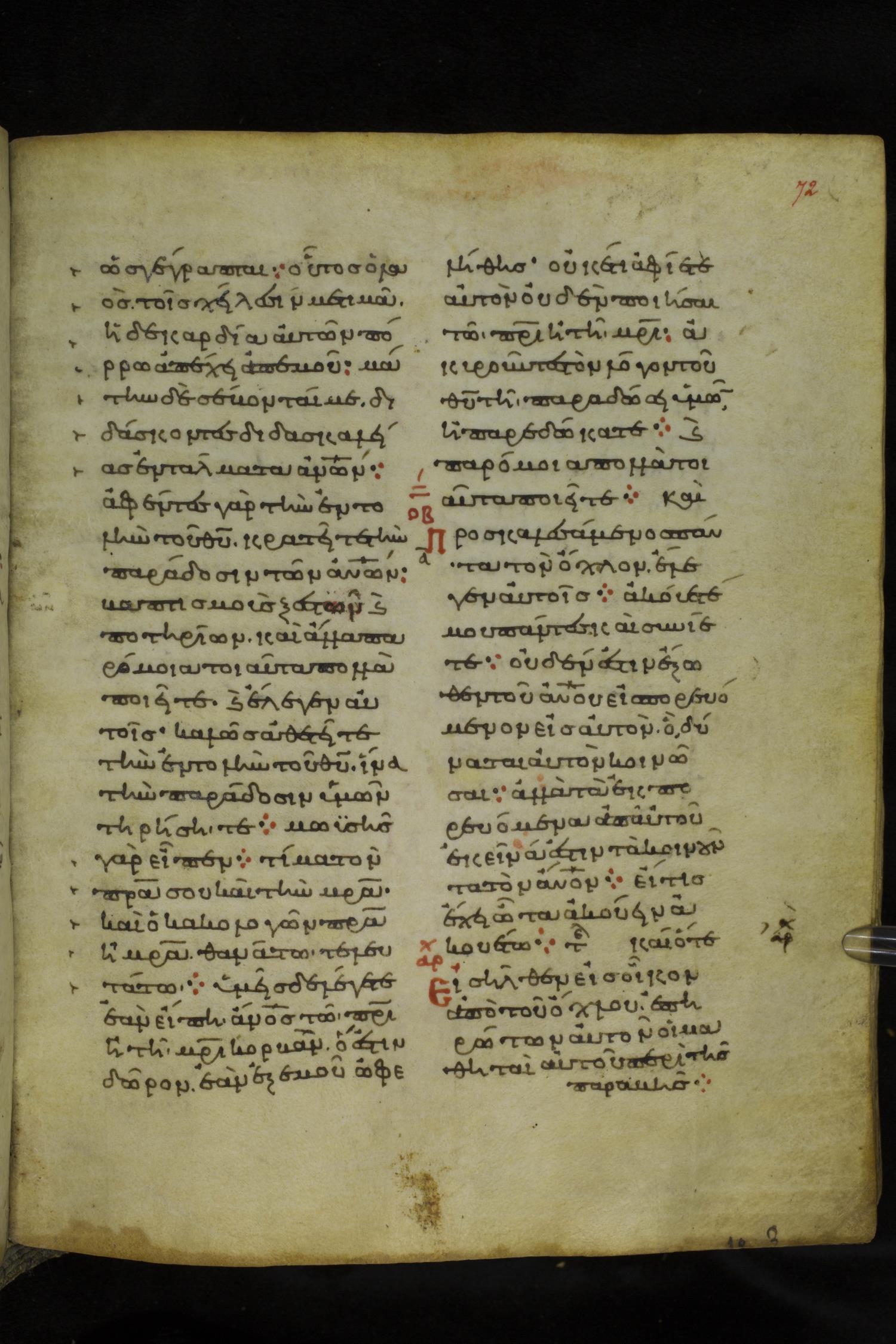 Eleventh century minuscule of the Gospels on parchment; 219 leaves, 2 columns, 26 lines per column. Images were taken at the National Library of Greece in Athens.