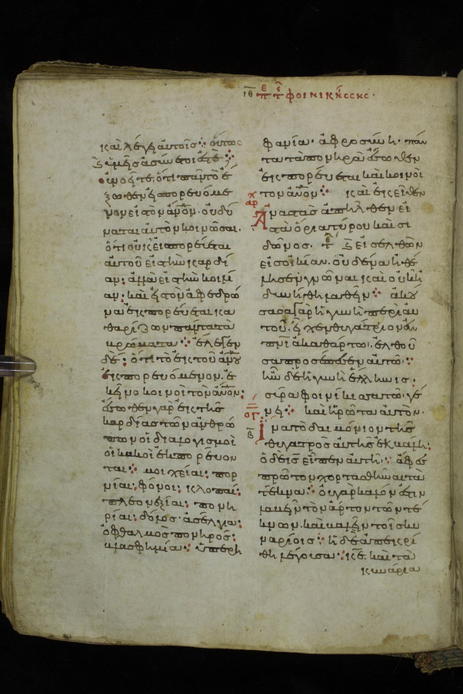 Eleventh century minuscule of the Gospels on parchment; 219 leaves, 2 columns, 26 lines per column. Images were taken at the National Library of Greece in Athens.