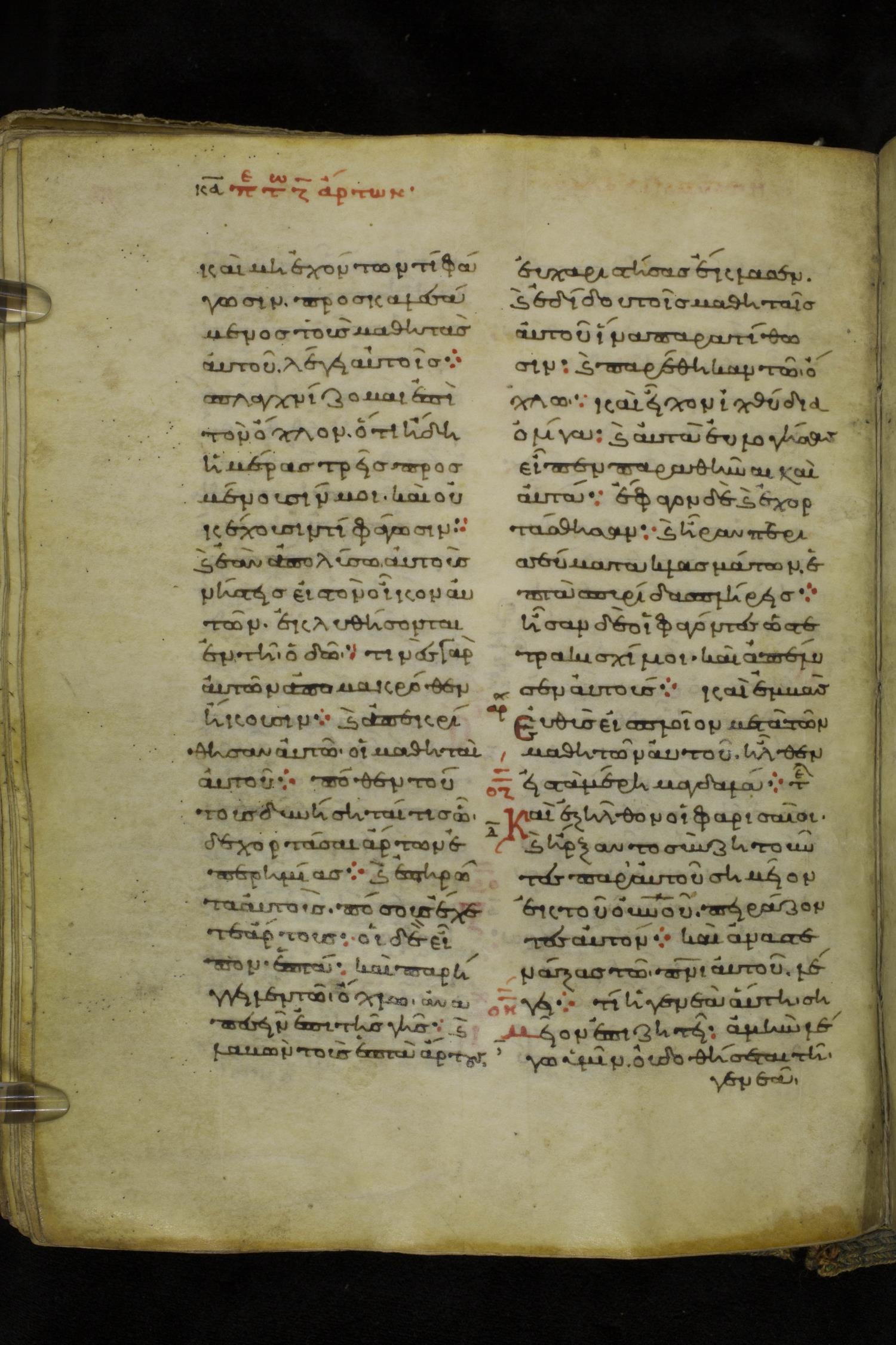Eleventh century minuscule of the Gospels on parchment; 219 leaves, 2 columns, 26 lines per column. Images were taken at the National Library of Greece in Athens.