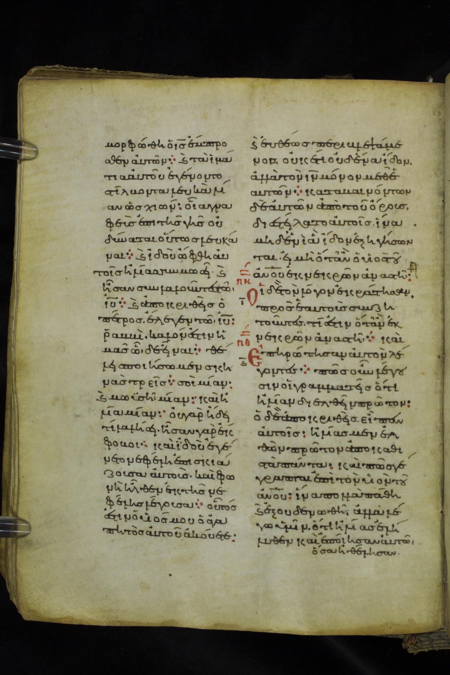Eleventh century minuscule of the Gospels on parchment; 219 leaves, 2 columns, 26 lines per column. Images were taken at the National Library of Greece in Athens.