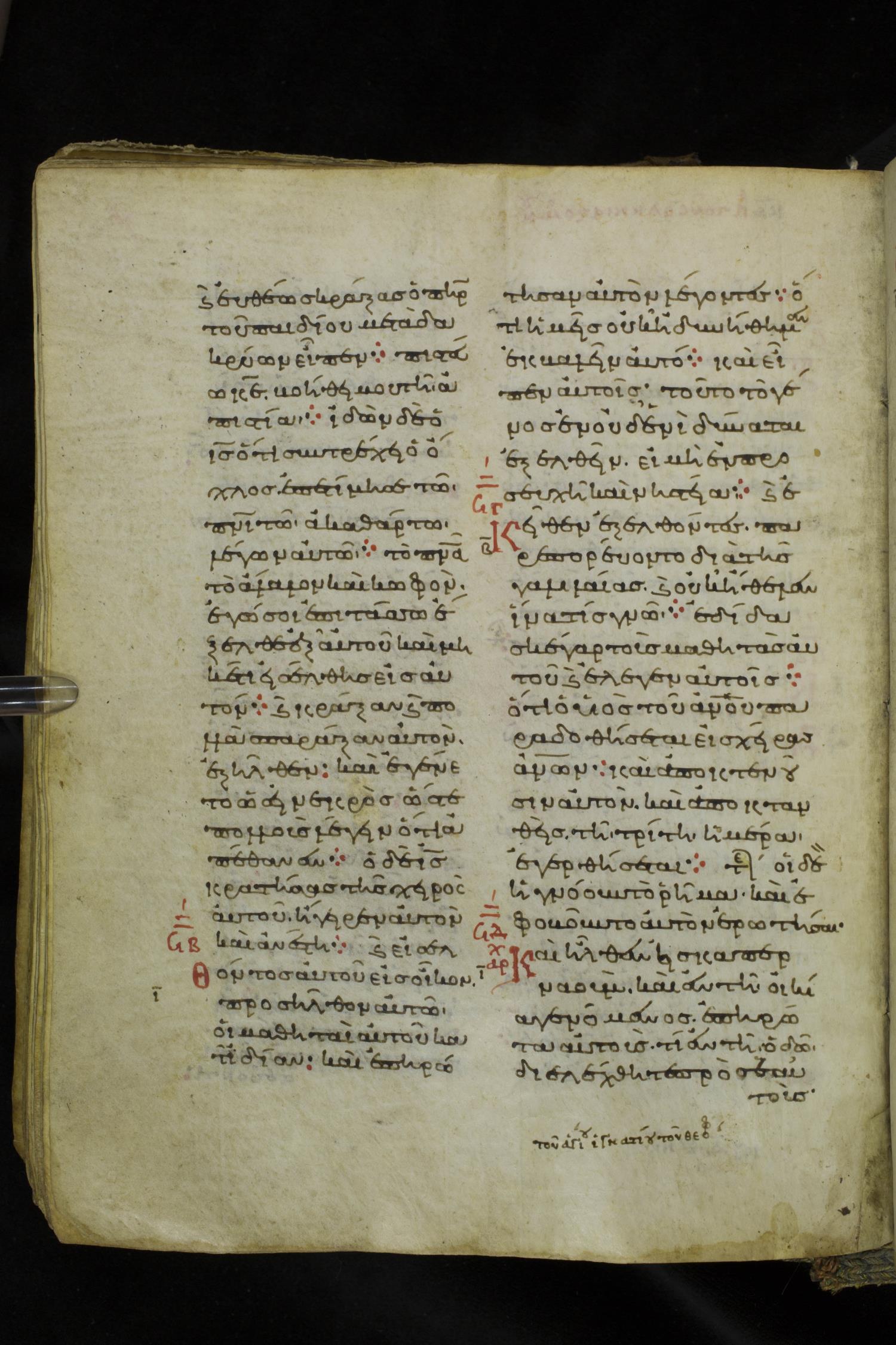 Eleventh century minuscule of the Gospels on parchment; 219 leaves, 2 columns, 26 lines per column. Images were taken at the National Library of Greece in Athens.