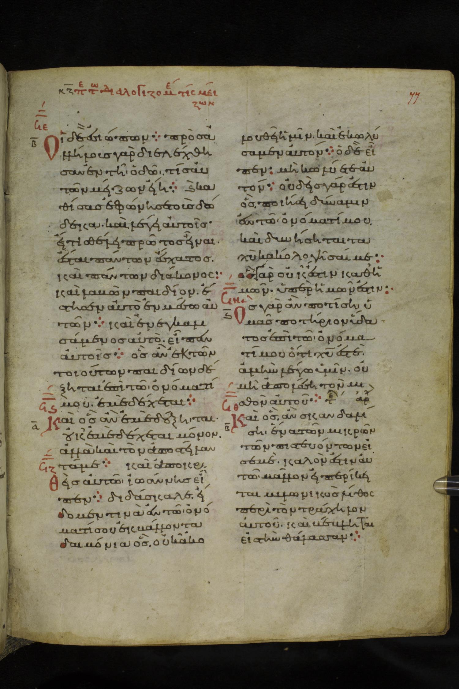 Eleventh century minuscule of the Gospels on parchment; 219 leaves, 2 columns, 26 lines per column. Images were taken at the National Library of Greece in Athens.