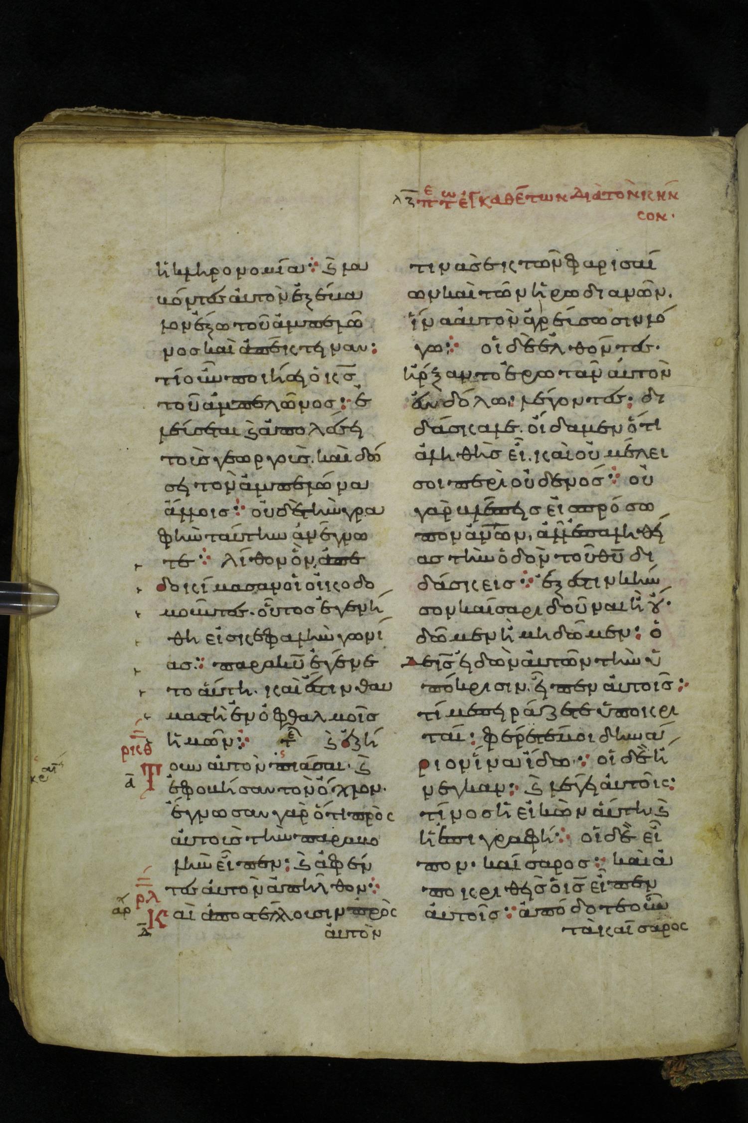 Eleventh century minuscule of the Gospels on parchment; 219 leaves, 2 columns, 26 lines per column. Images were taken at the National Library of Greece in Athens.