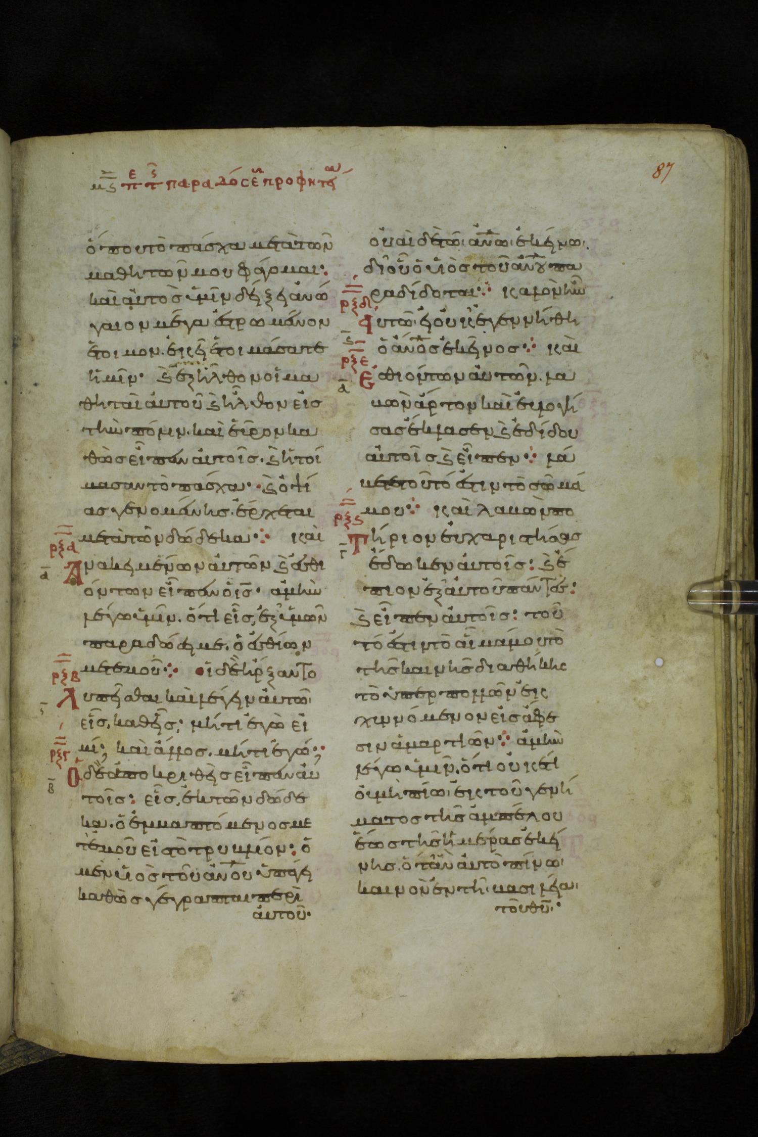 Eleventh century minuscule of the Gospels on parchment; 219 leaves, 2 columns, 26 lines per column. Images were taken at the National Library of Greece in Athens.