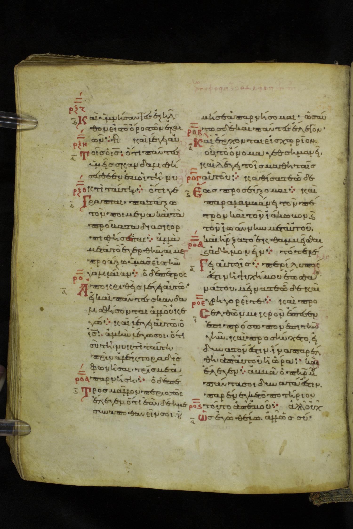 Eleventh century minuscule of the Gospels on parchment; 219 leaves, 2 columns, 26 lines per column. Images were taken at the National Library of Greece in Athens.