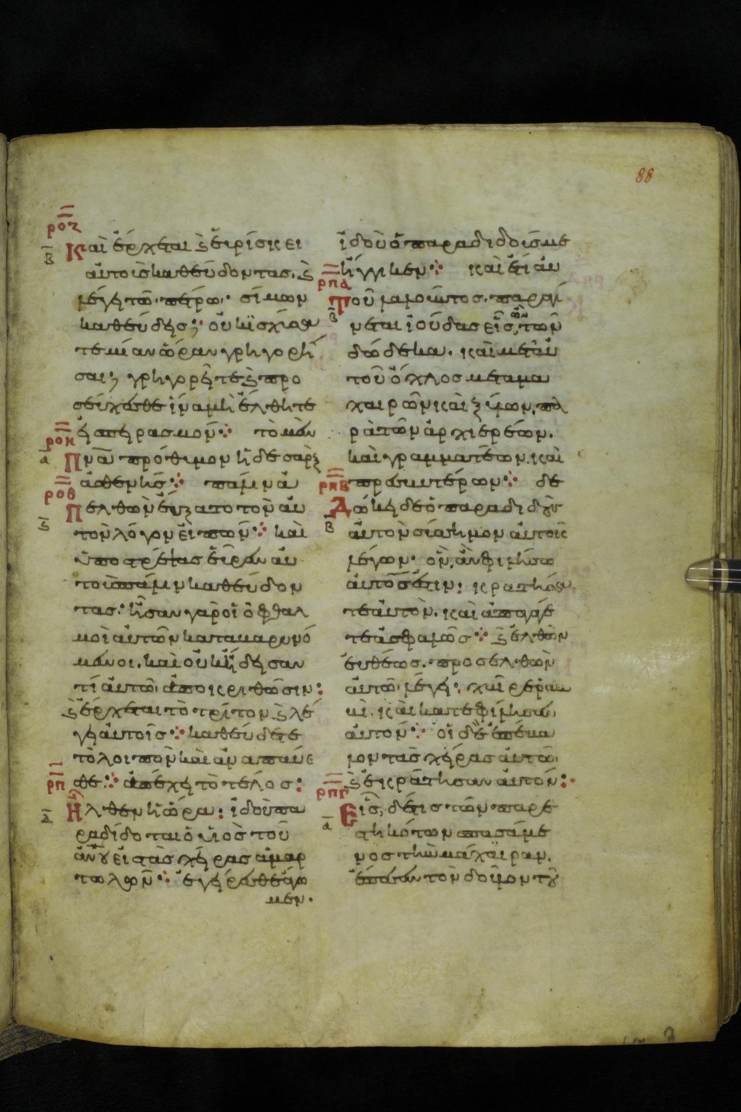 Eleventh century minuscule of the Gospels on parchment; 219 leaves, 2 columns, 26 lines per column. Images were taken at the National Library of Greece in Athens.