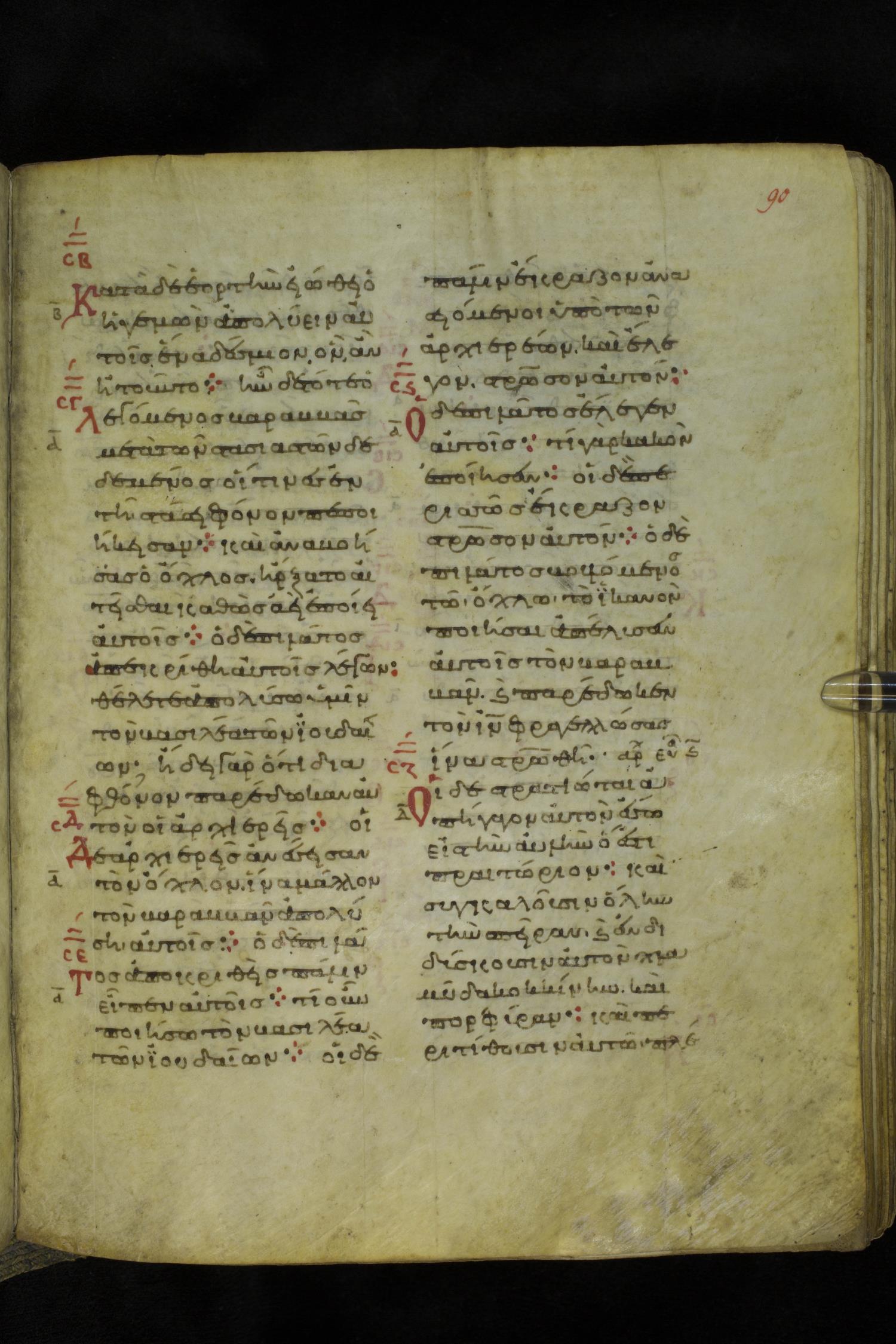 Eleventh century minuscule of the Gospels on parchment; 219 leaves, 2 columns, 26 lines per column. Images were taken at the National Library of Greece in Athens.