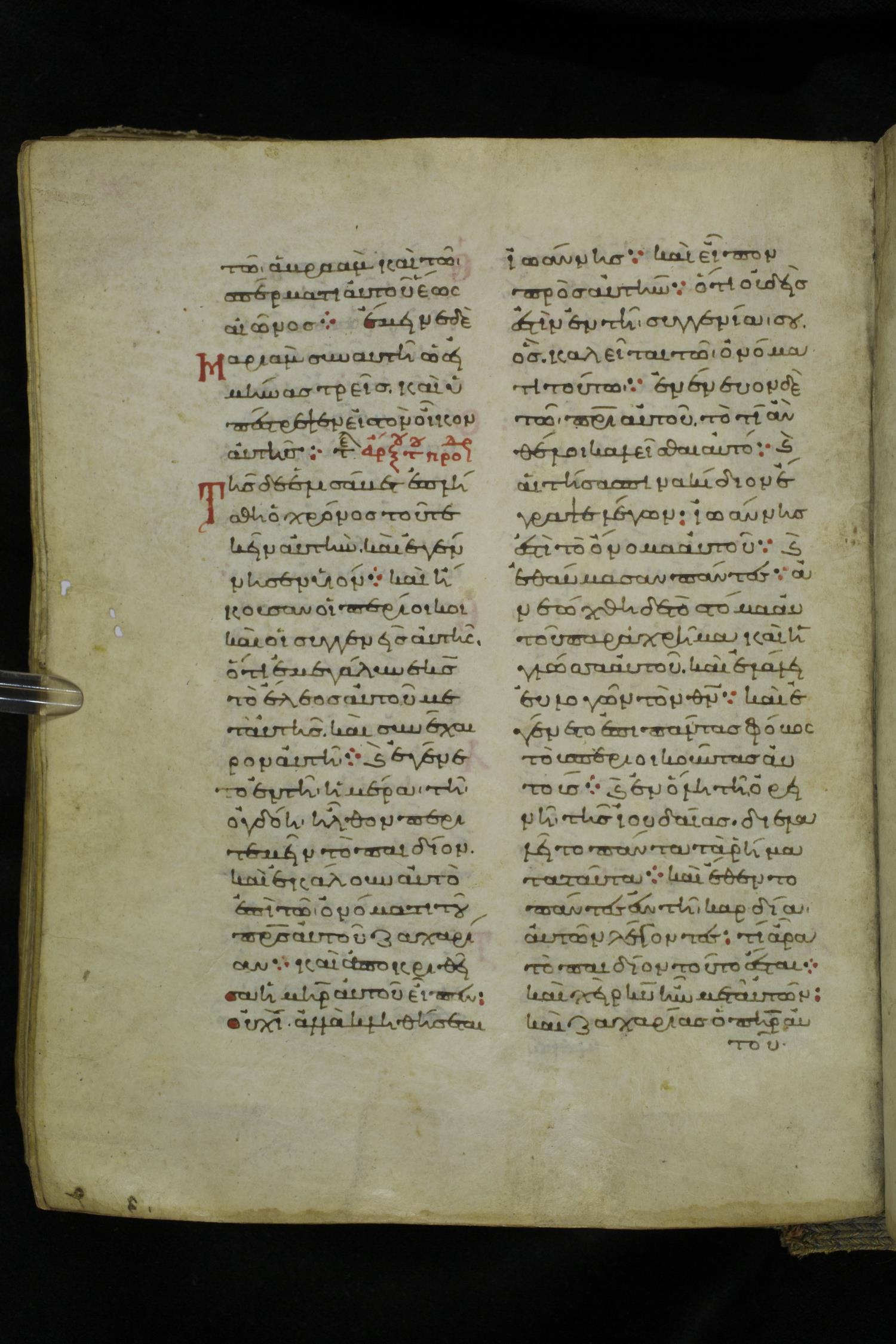 Eleventh century minuscule of the Gospels on parchment; 219 leaves, 2 columns, 26 lines per column. Images were taken at the National Library of Greece in Athens.