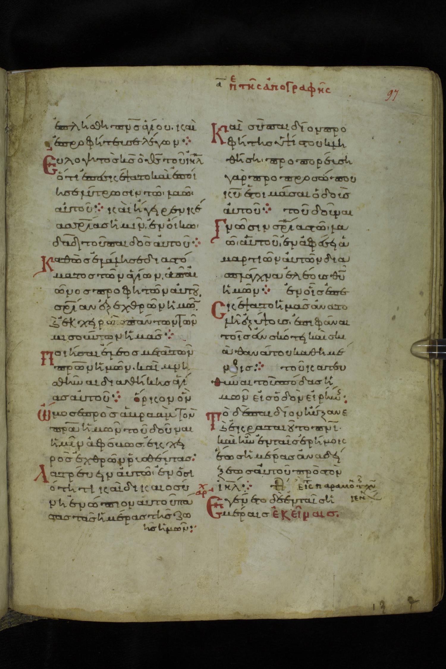Eleventh century minuscule of the Gospels on parchment; 219 leaves, 2 columns, 26 lines per column. Images were taken at the National Library of Greece in Athens.