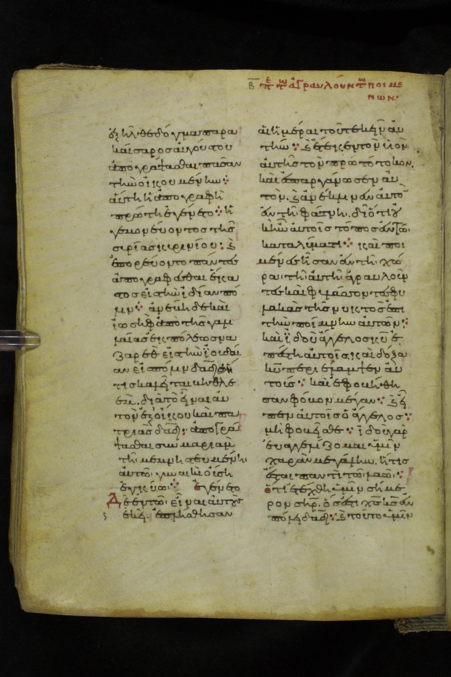 Eleventh century minuscule of the Gospels on parchment; 219 leaves, 2 columns, 26 lines per column. Images were taken at the National Library of Greece in Athens.