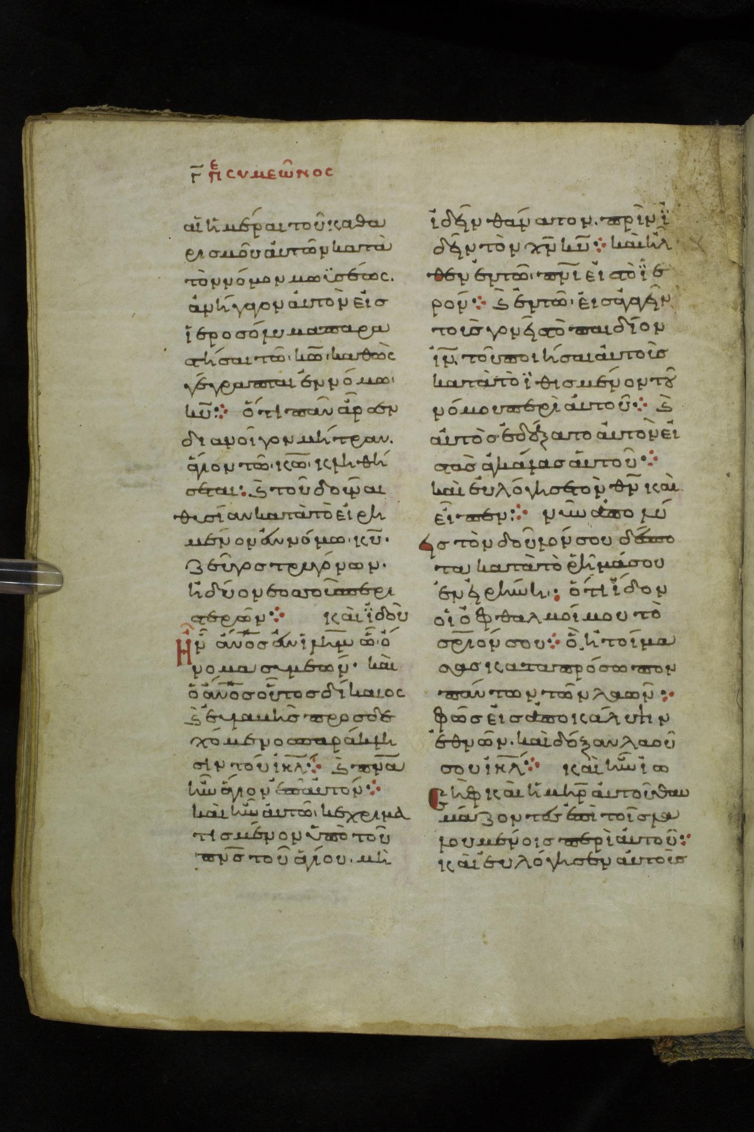 Eleventh century minuscule of the Gospels on parchment; 219 leaves, 2 columns, 26 lines per column. Images were taken at the National Library of Greece in Athens.