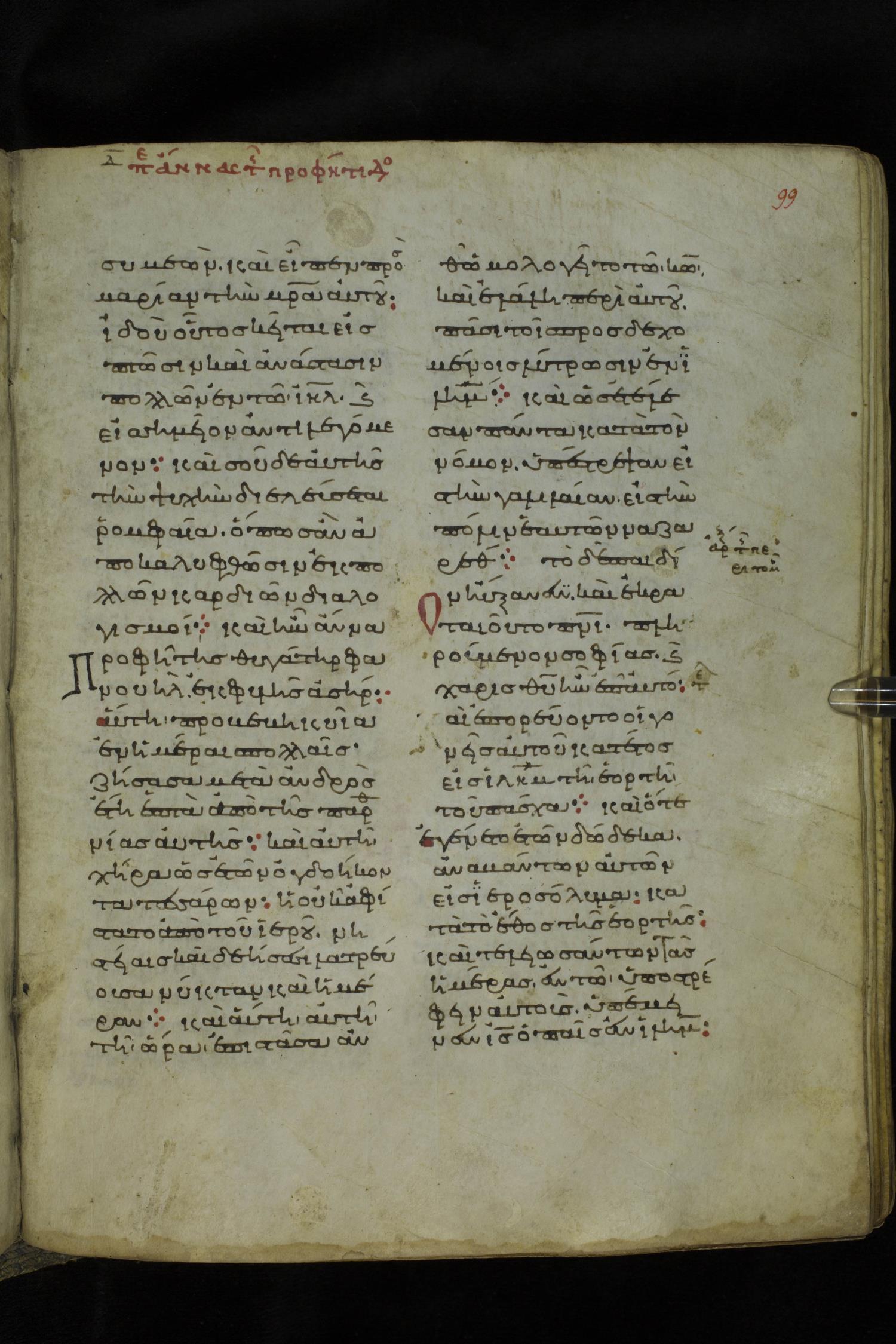 Eleventh century minuscule of the Gospels on parchment; 219 leaves, 2 columns, 26 lines per column. Images were taken at the National Library of Greece in Athens.