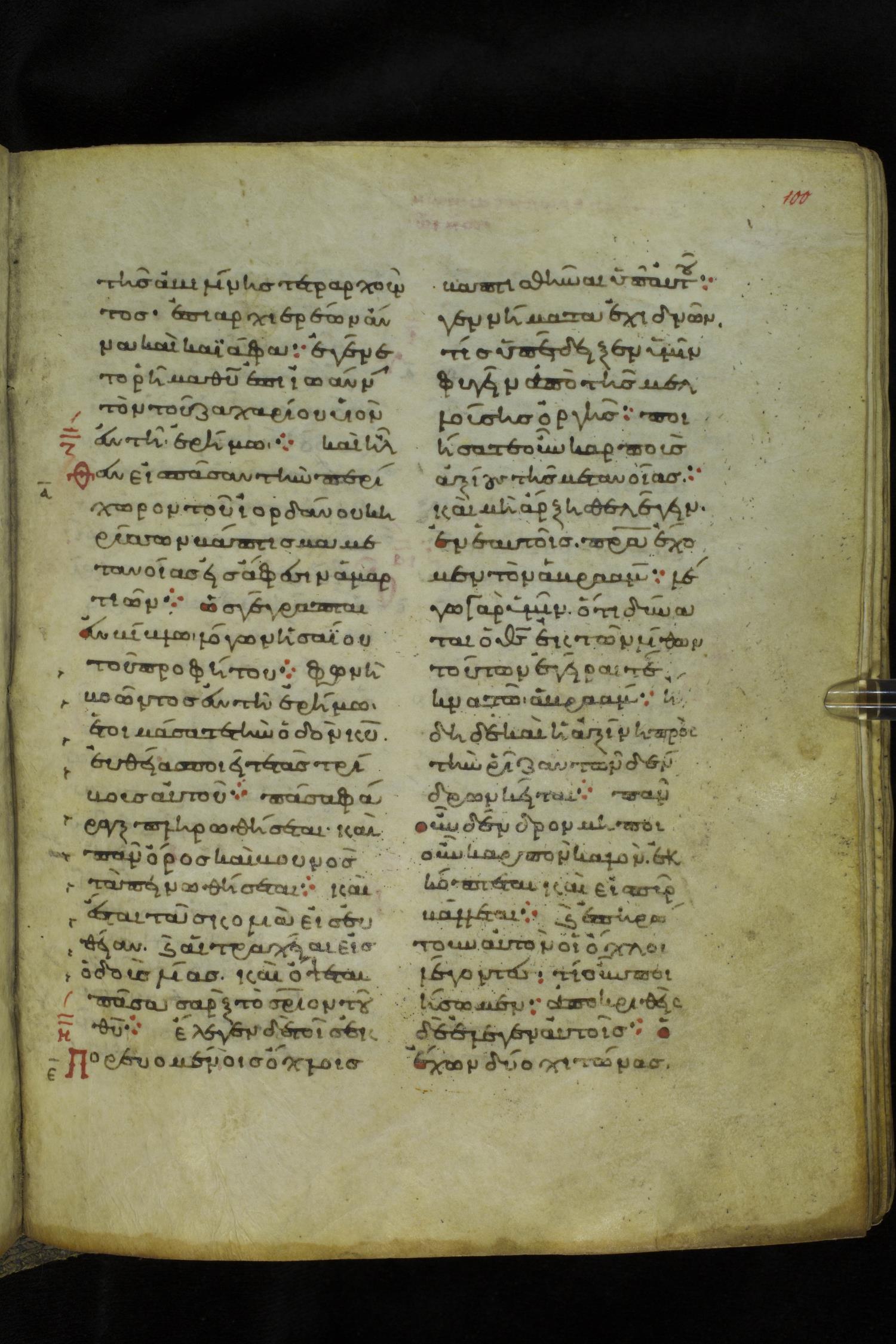 Eleventh century minuscule of the Gospels on parchment; 219 leaves, 2 columns, 26 lines per column. Images were taken at the National Library of Greece in Athens.