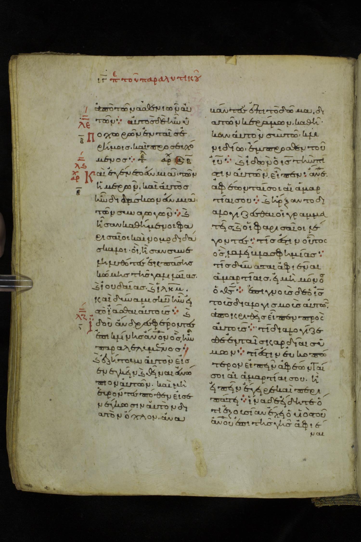 Eleventh century minuscule of the Gospels on parchment; 219 leaves, 2 columns, 26 lines per column. Images were taken at the National Library of Greece in Athens.