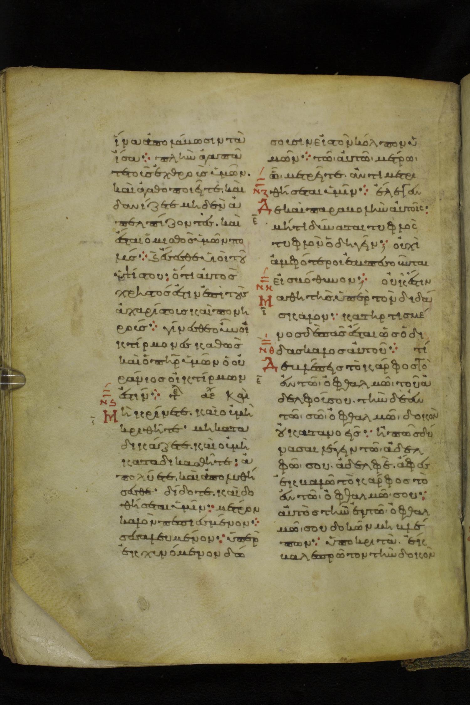 Eleventh century minuscule of the Gospels on parchment; 219 leaves, 2 columns, 26 lines per column. Images were taken at the National Library of Greece in Athens.