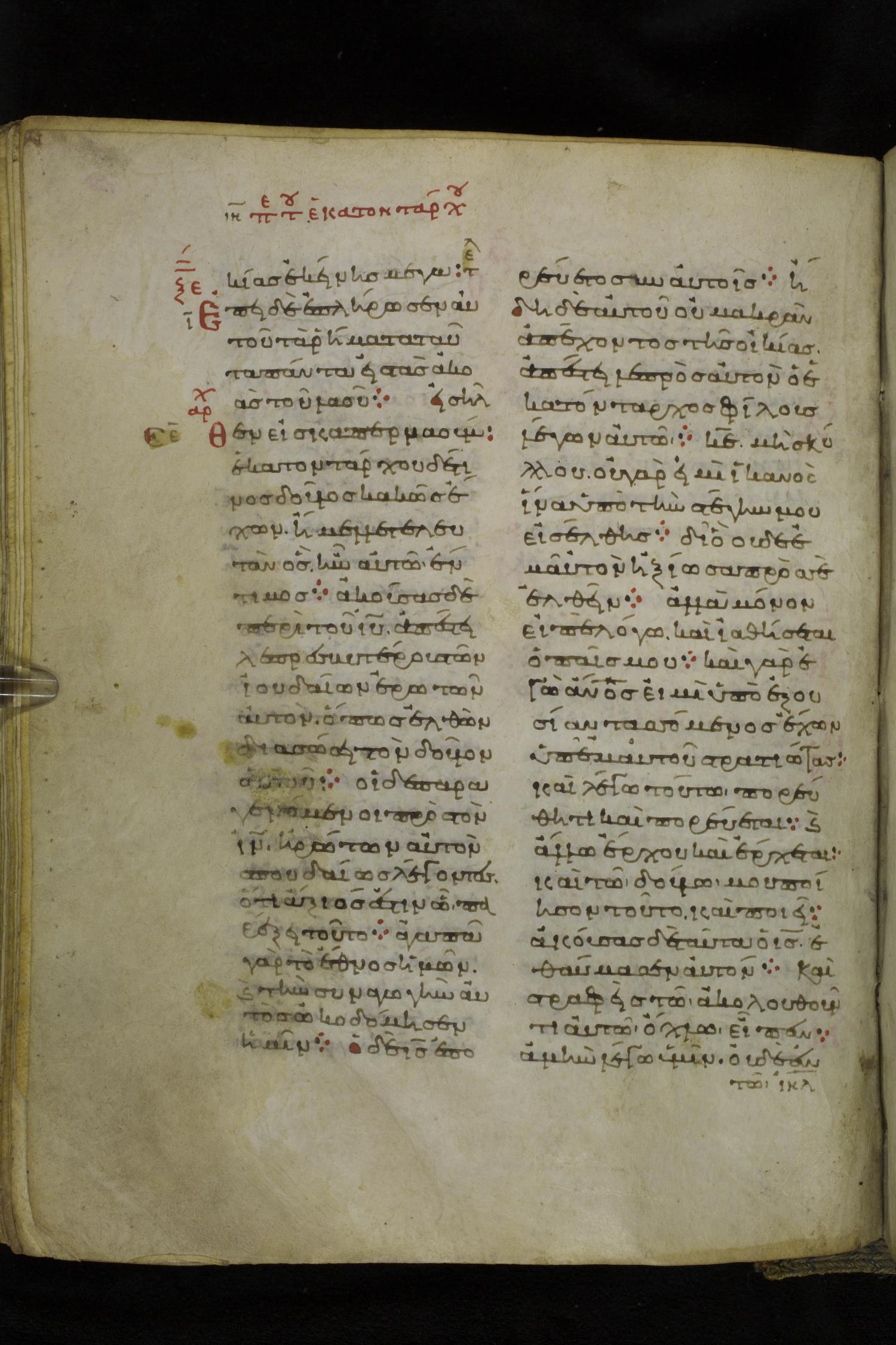 Eleventh century minuscule of the Gospels on parchment; 219 leaves, 2 columns, 26 lines per column. Images were taken at the National Library of Greece in Athens.