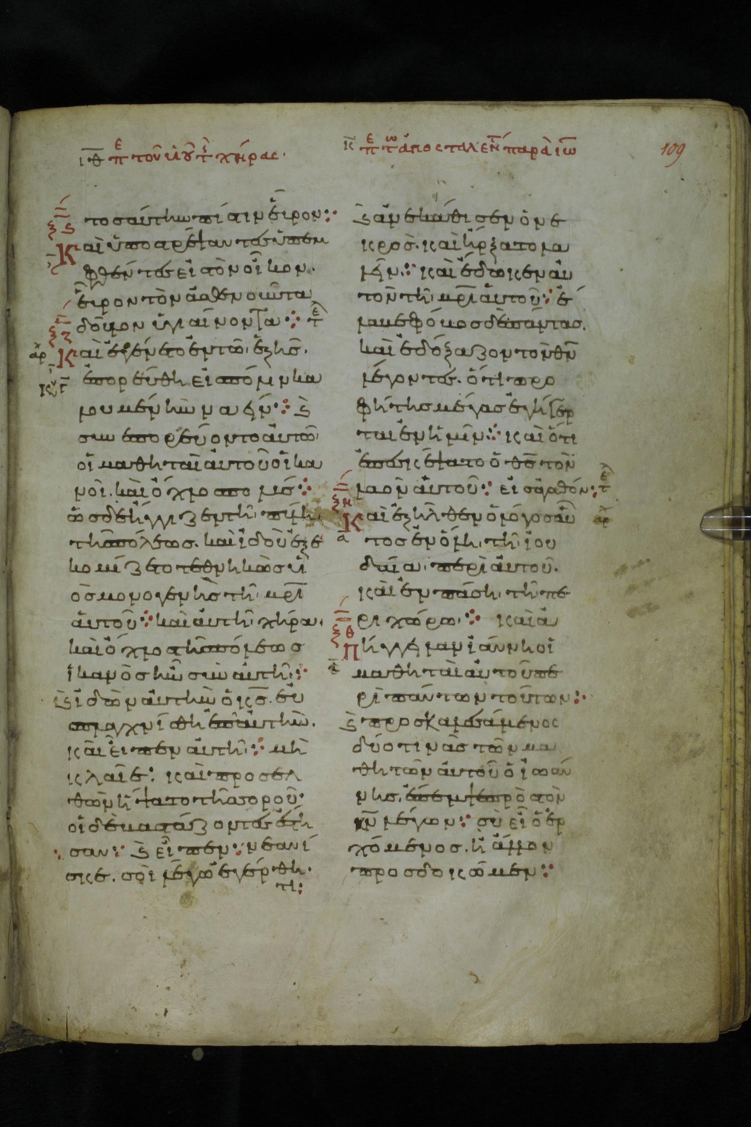 Eleventh century minuscule of the Gospels on parchment; 219 leaves, 2 columns, 26 lines per column. Images were taken at the National Library of Greece in Athens.