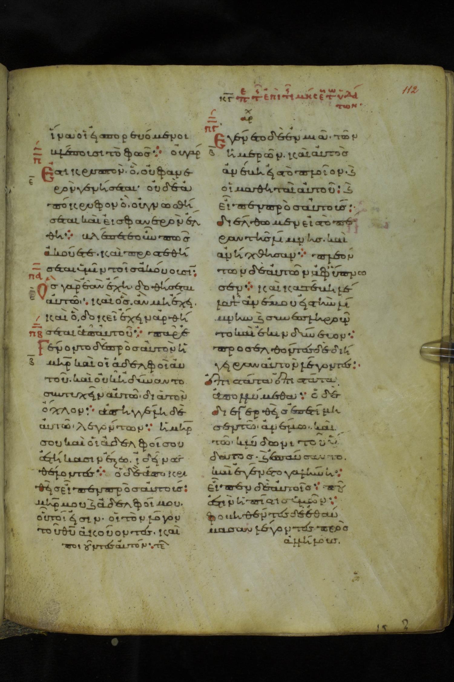 Eleventh century minuscule of the Gospels on parchment; 219 leaves, 2 columns, 26 lines per column. Images were taken at the National Library of Greece in Athens.