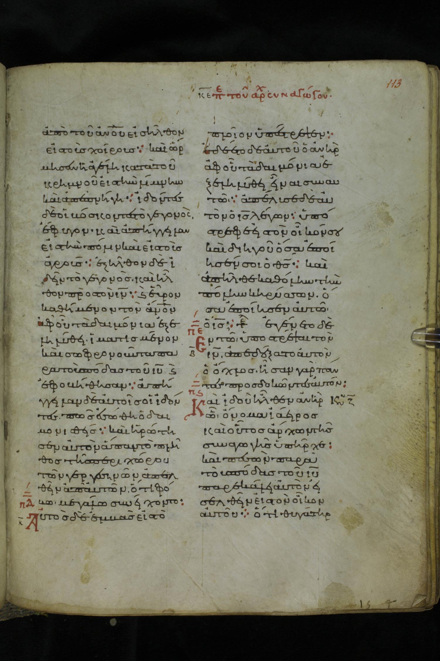Eleventh century minuscule of the Gospels on parchment; 219 leaves, 2 columns, 26 lines per column. Images were taken at the National Library of Greece in Athens.