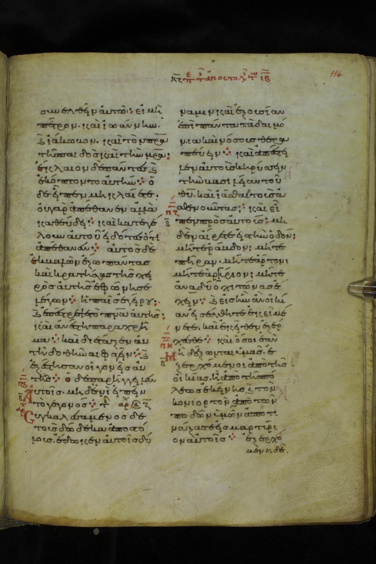 Eleventh century minuscule of the Gospels on parchment; 219 leaves, 2 columns, 26 lines per column. Images were taken at the National Library of Greece in Athens.