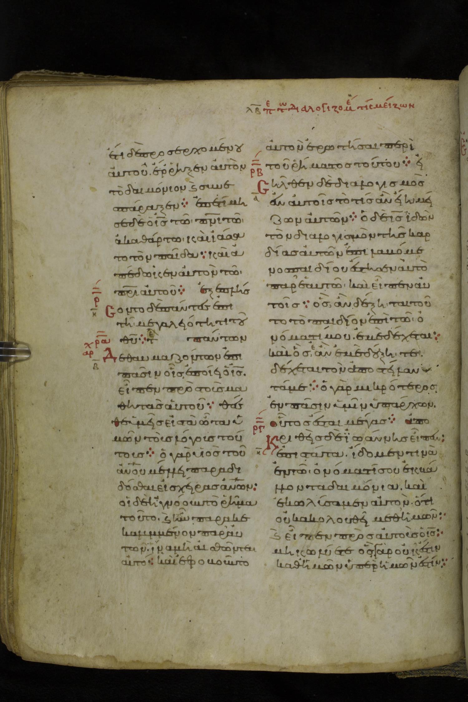 Eleventh century minuscule of the Gospels on parchment; 219 leaves, 2 columns, 26 lines per column. Images were taken at the National Library of Greece in Athens.