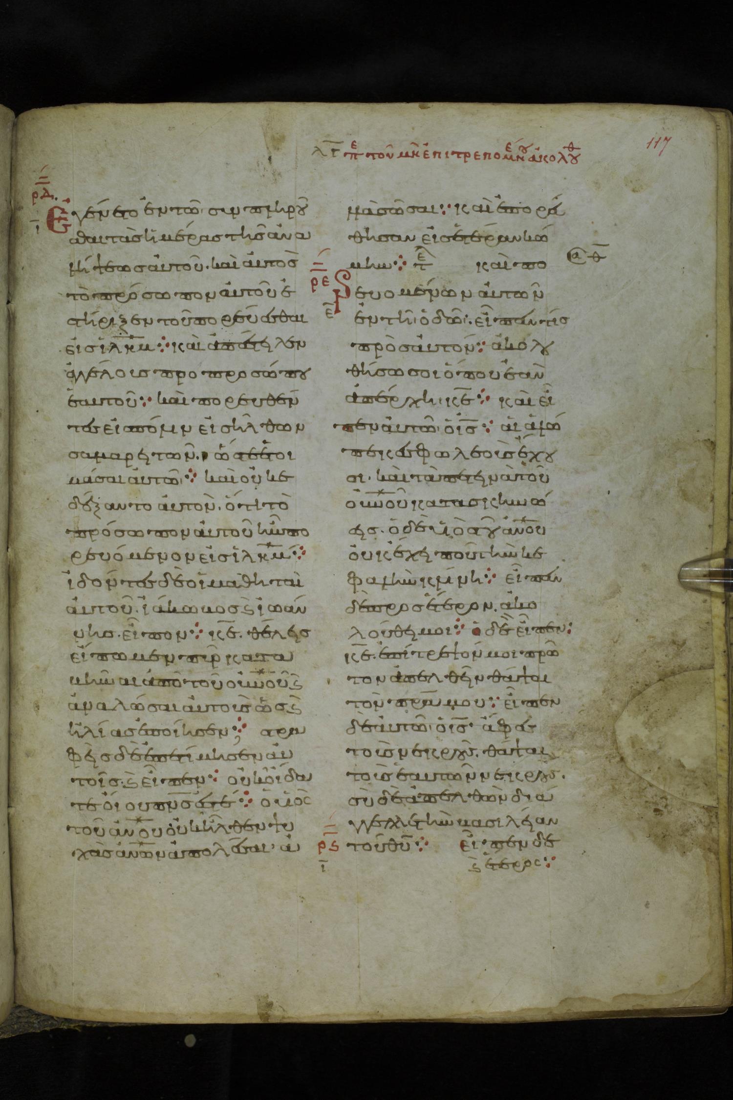 Eleventh century minuscule of the Gospels on parchment; 219 leaves, 2 columns, 26 lines per column. Images were taken at the National Library of Greece in Athens.
