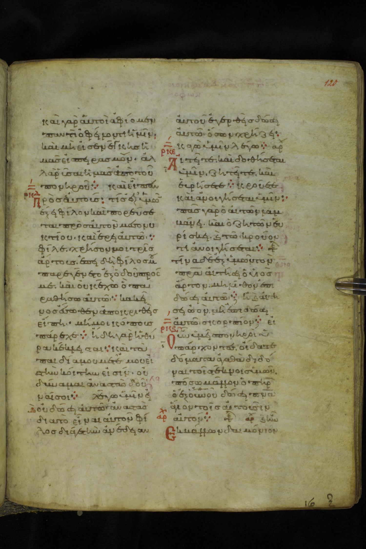 Eleventh century minuscule of the Gospels on parchment; 219 leaves, 2 columns, 26 lines per column. Images were taken at the National Library of Greece in Athens.